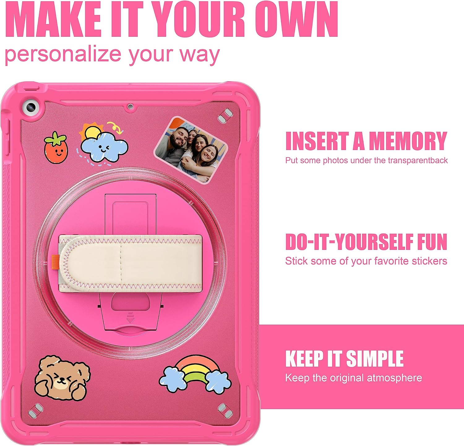 ZenRich Clear Case for iPad 9th/8th/7th Generation 10.2 inch 2021/2020/2019, Shockproof Slim Hard Case with Pencil Holder/360°Rotating Kickstand/Handle/Carrying Strap, Rose