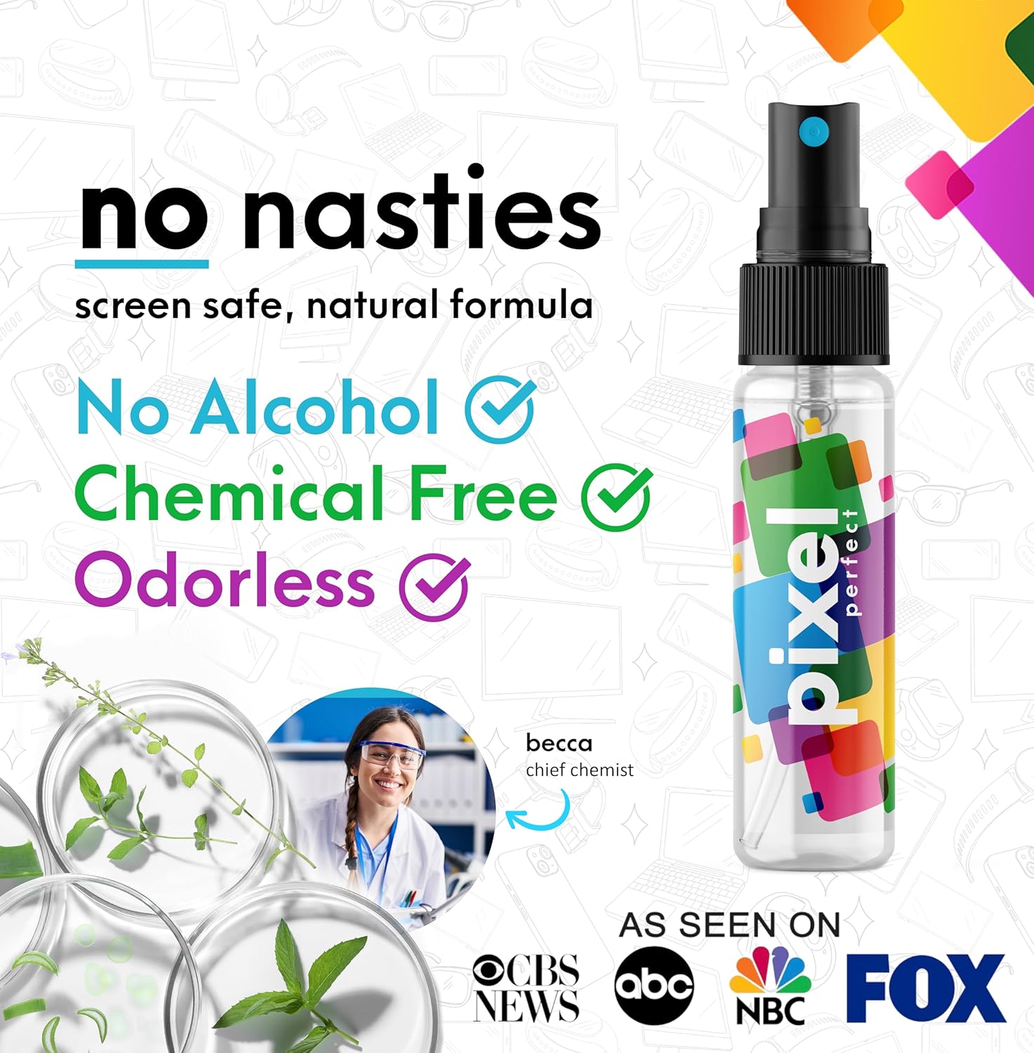 - SAFE FOR SCREENS: Pixel Perfect is specifically designed to be compatible with all types of delicate screens, coatings and finishes. 100% free from harsh chemicals, ammonia, alcohol and toxins, there’s nothing inside our formula that screens won’t love. Perfect for TV’s, Phones, Eye Glasses, Monitors, Tablets and More