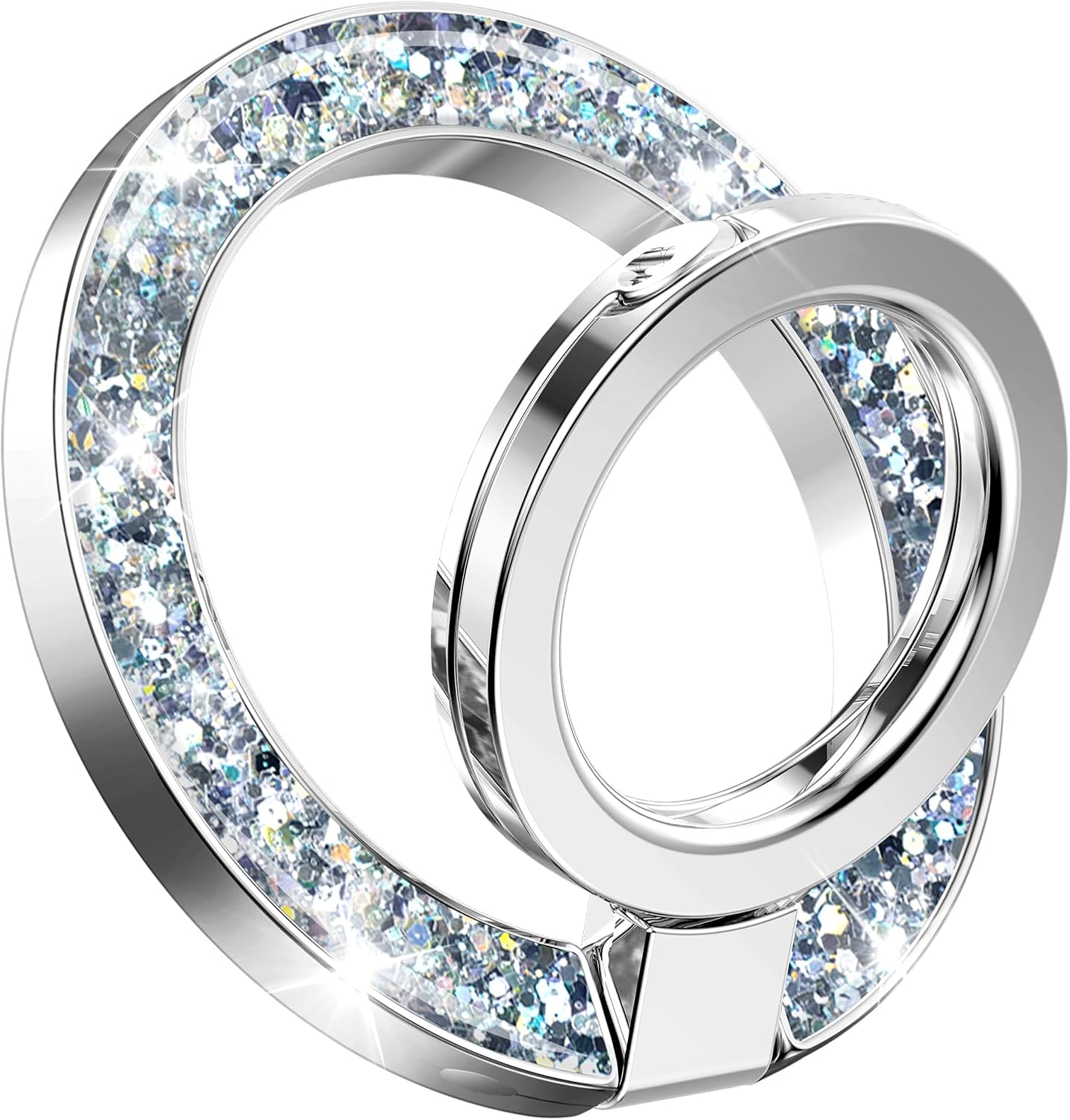 GVIEWIN Magnetic Phone Ring Holder, Compatible with MagSafe Phone Grip with Adjustable Stand, Magnet Phone Ring Kickstand for iPhone 16 Pro Max/Plus/15/14/13/12 Series/Other Phones (Glitter/Silver)