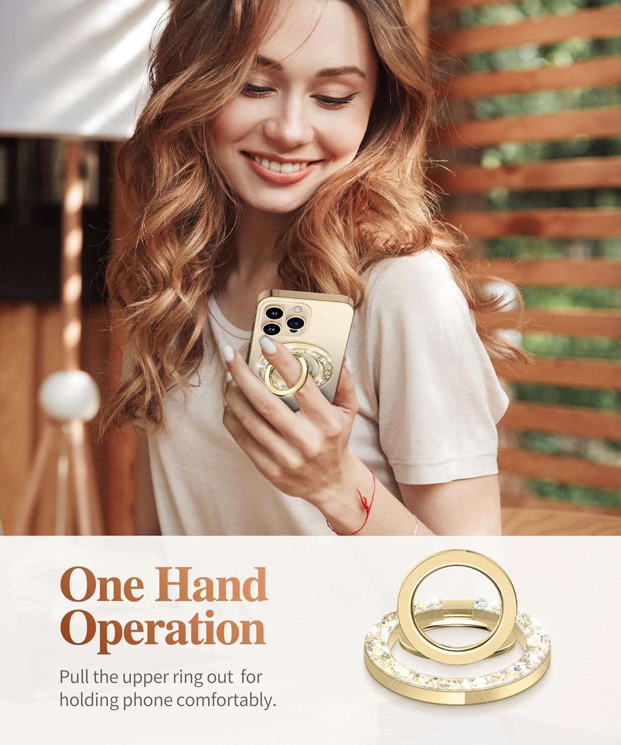 GVIEWIN Magnetic Phone Ring Holder, Compatible with MagSafe Phone Grip with Adjustable Stand, Magnet Phone Ring Kickstand for iPhone 16 Pro Max/Plus/15/14/13/12 Series/Other Phones (Glitter/Gold)