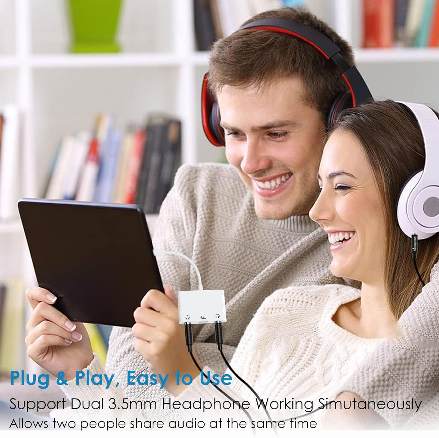 - 3-in-1 USB C to Headphone Adapte: This USB C to Audio Adapter comes with two 3.5mm headphone jacks and a USB C fast charging port to work and charge at the same time. Support two people listening to music or watching movies together