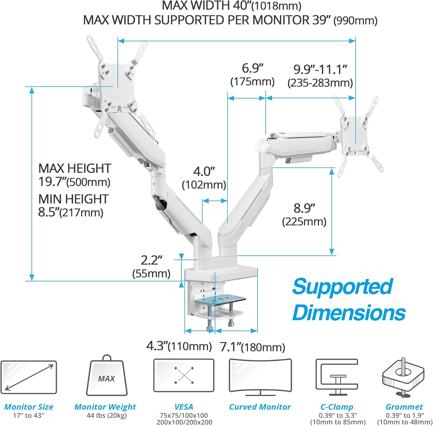 - Fits 17" to 43" Screens: Dual monitor desk mount supports most flat, curved, and ultrawide monitors up to 44 lbs (20 kg) each; VESA compatible with 75x75 mm, 100x100 mm, 200x100 mm, or 200x200 mm mounting holes.