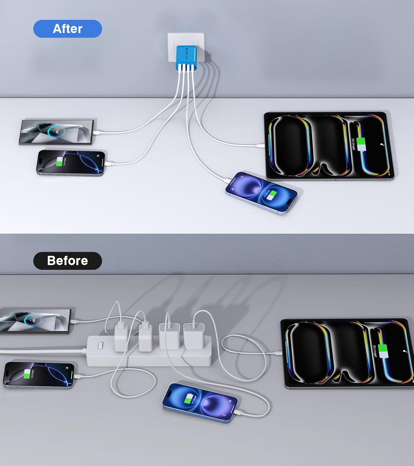 - Multiport Charging:The charger block has Dual USB-C ports and Dual USB-A ports. Allow users to charge phone, tablet and headphones simultaneously to minimize waiting time. It’s also a great space saver instead of taking up 4 wall outlet ports. The best replacement for your original usb charger