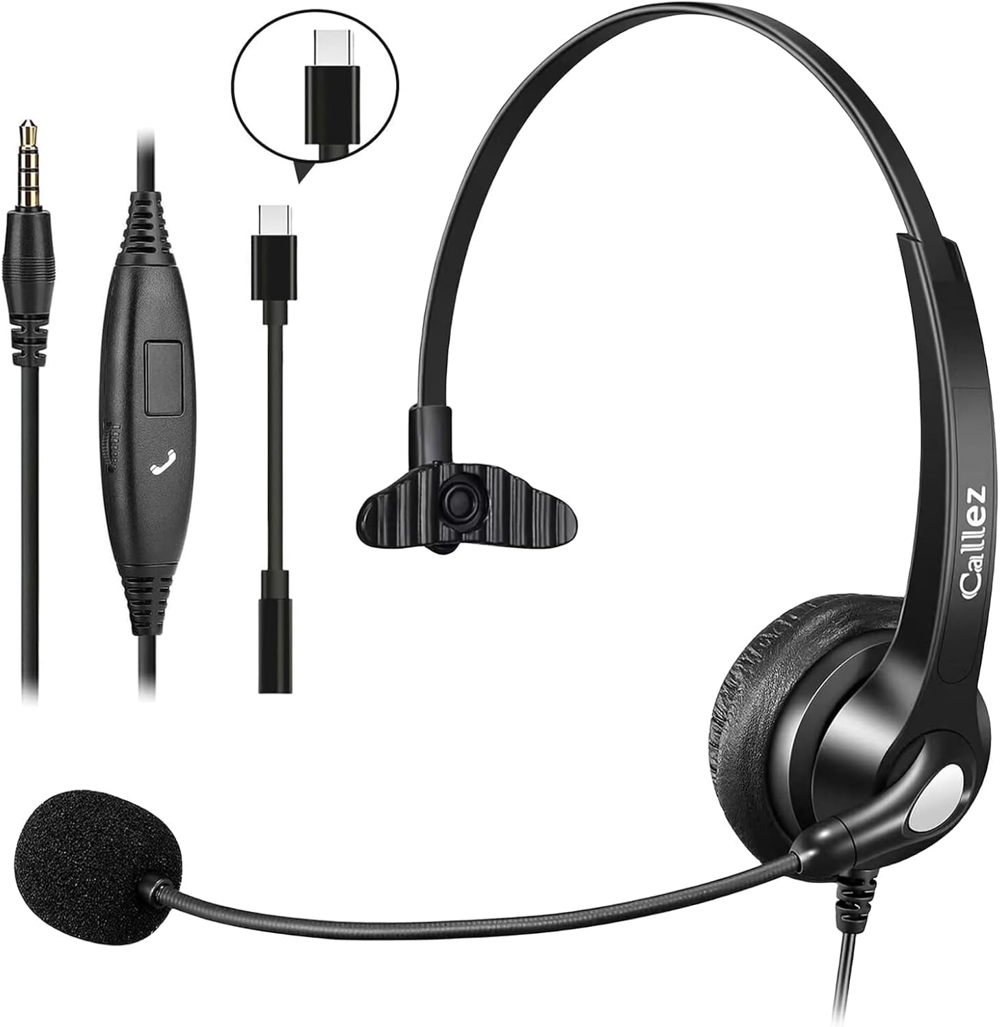 - SUPER LIGHTWEIGHT & COMFORTABLE: Callez hands free 3.5mm/USB-C headset with adjustable headband allows to fit all head sizes. The soft and high quality leatherette ear cushion and super lightweight design ensure all-day comfortable wearing.