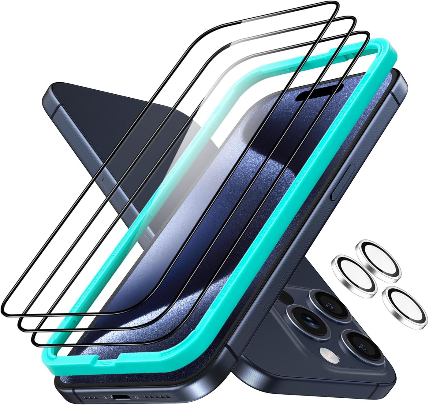 ESR 3+1 Pack for iPhone 15 Pro Screen Protector, [9H Hardness] [Military Grade Shatterproof] Full Coverage Ultra-tough Tempered Glass Film with Easy Installation Frame, 1 Set of Camera Lens Protector