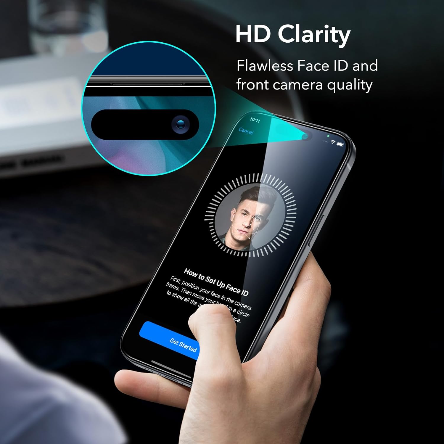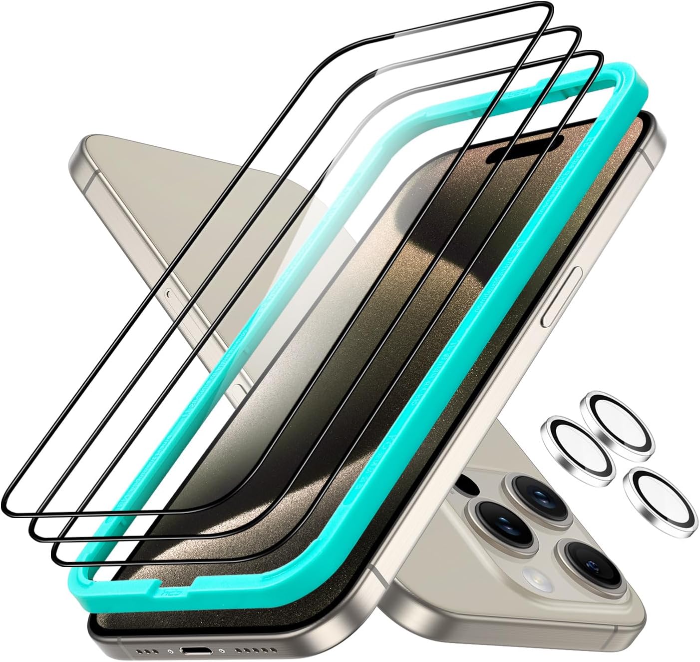 ESR 3+1 Pack for iPhone 15 Pro Max Screen Protector, [9H Hardness] [Military Grade Shatterproof] Full Coverage Ultra-tough Tempered Glass Film, Easy Installation Frame, 1 Set of Camera Lens Protector
