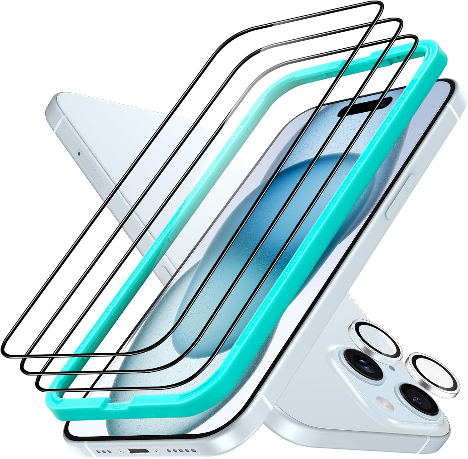 ESR 3+1 Pack for iPhone 15 Plus Screen Protector, [9H Hardness] [Military Grade Shatterproof] Full Coverage Ultra-tough Tempered Glass Film with Easy Installation Frame, 1 Set of Camera Lens Protector