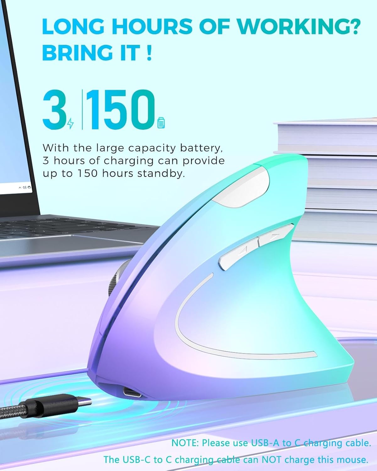 - High-Capacity Rechargeable Battery: The wireless ergonomic mouse has a built-in rechargeable battery. You no longer need to buy batteries, it is very convenient !! 3 hours of charging can provide up to 150 hours of use. Easy to Use -- One nano 2.4 GHz USB receiver at the bottom of the vertical wireless mouse, Just Plug and Play! NO Bluetooth