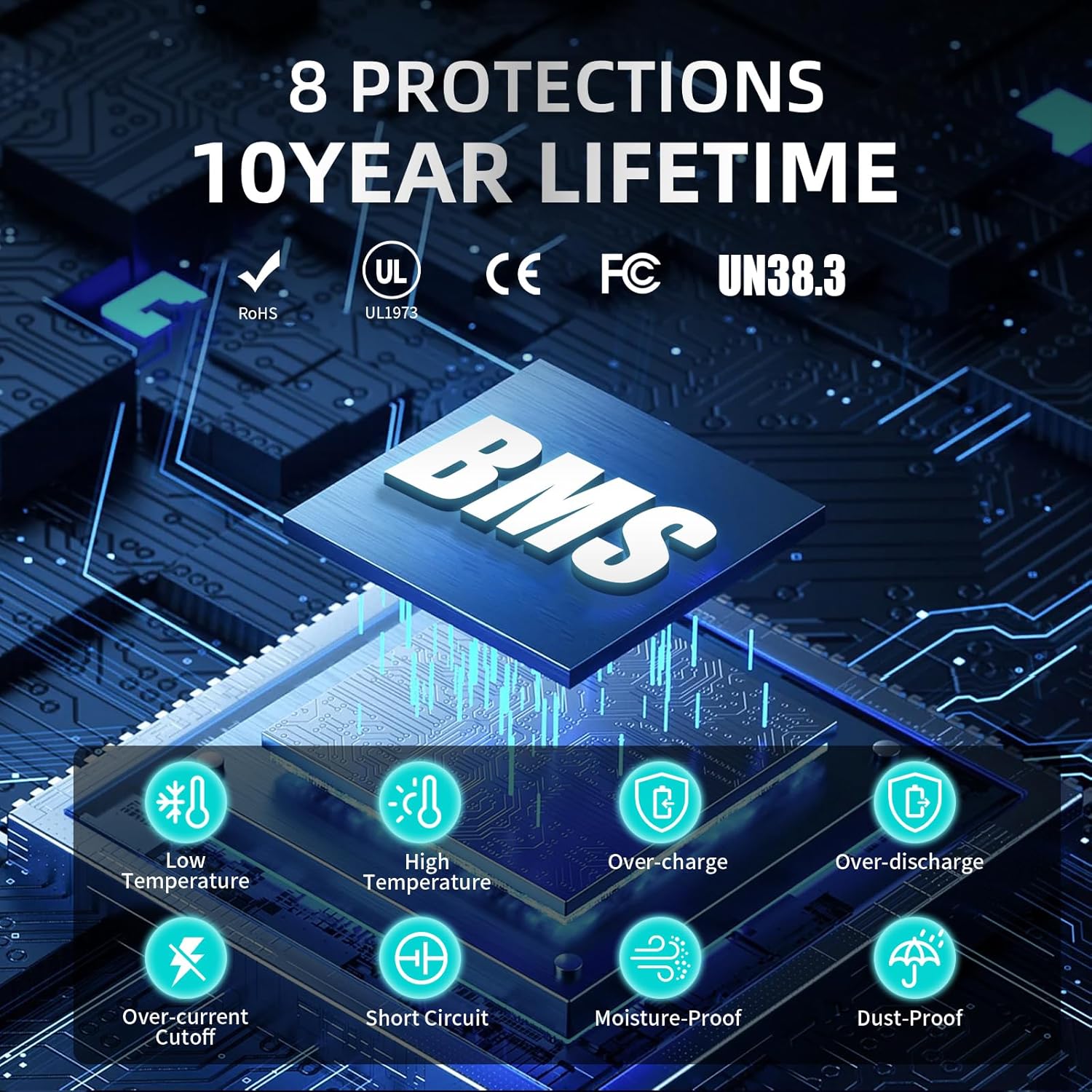 - 【10 Years Life】LiFePO4 batteries provide 3000-10000 cycles, 5000 cycles at 80% DOD and 8000 cycles at 60% DOD. LiFePO4 batteries can be 100% discharged while lead-acid batteries can only be 40%-50% discharged.12v lithium battery has an excellent discharge rate with a self-discharge rate of less than 3%, eliminating the need for frequent charging when not in use. Compared with lead-acid batteries with 200~500 cycles and 3 years life span, the life span is up to 10 years.
