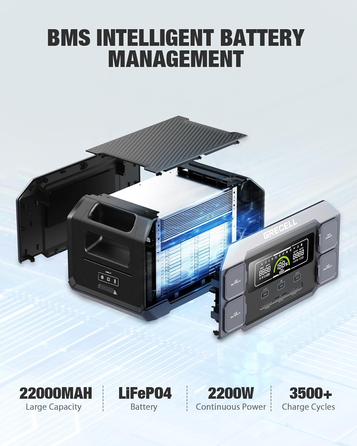 GRECELL Solar Generator 2200W Portable Power Station 1126Wh (4800W Peak), 1.25Hrs Fast Charging, LiFePO4 Battery Pack with 4×2200W AC Outlets, 2×PD 100W, Solar Generator for Home Use Outdoor RV