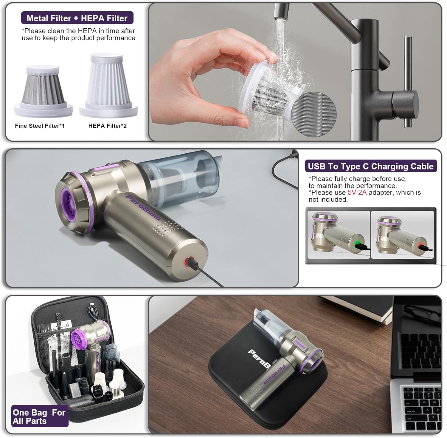 - Enhanced Filtration System: Features 1 steel filter and 2 rewashable HEPA filters for effective dust filtration, a sustainable solution that offers your mini vacuum remains effective and powerful over time
