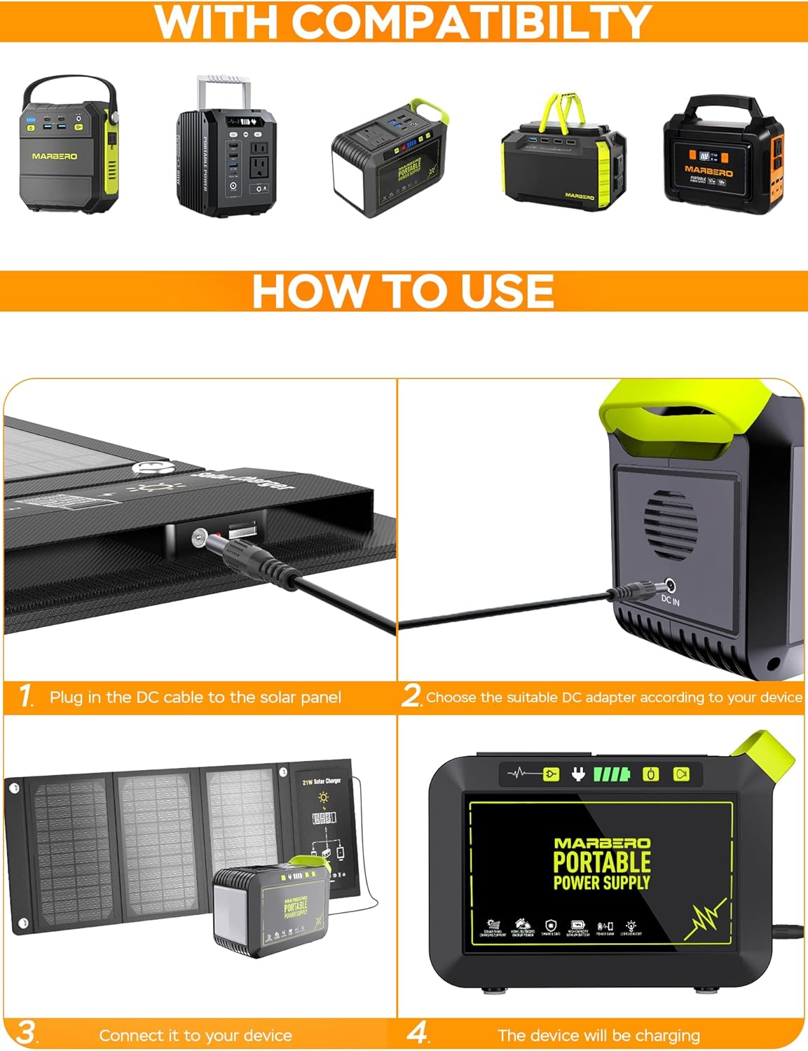 - WIDE COMPATIBILITY: The USB A and DC ports are built into the power box of the MARBERO 21-watt portable foldable solar panel charger, making it perfect for charging your smartphones, tablets, laptops, power bank, speaker, portable power stations, and more. This portable solar panel, designed for camping and outdoor use, offers a reliable solar panel charging solution wherever you go, whether you're using it as a camping solar panel or for general on-the-go power needs. Our portable solar charger can't store electricity and can't charge laptops and power station.