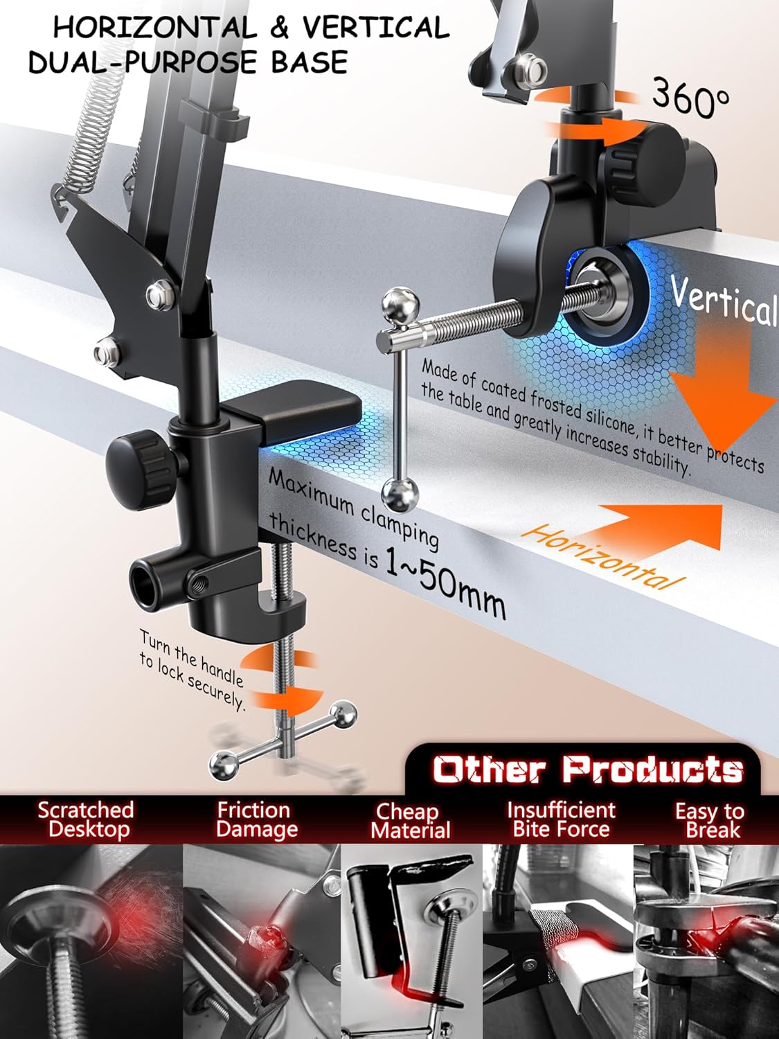 - Base for vertical and horizontal use:The base is equipped with two jacks, which can realize the vertical and horizontal use of the stand, and it is equipped with a silicone mat, which will not damage your headboard, and has high stability during use. The base can firmly clamp the table, bedside and other installation surfaces by about 40mm. Installation requires no tools or holes.