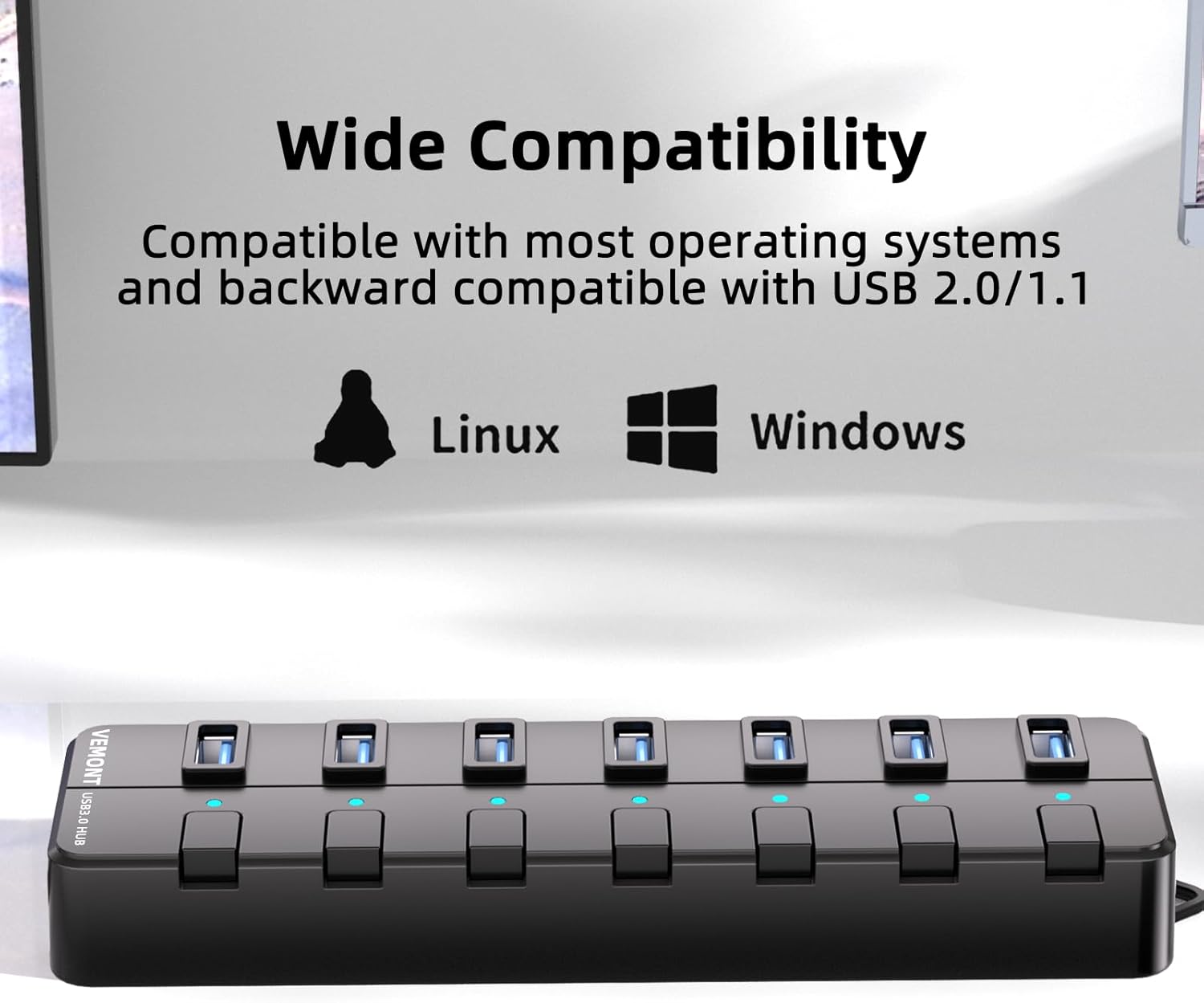 - 【𝗨𝗻𝗶𝗾𝘂𝗲 𝗗𝗲𝘀𝗶𝗴𝗻 】The unique triangular hook design can not only effectively prevent movement during use, but also keep the indoor environment tidy. What You Get: VEMONT 7 Port USB 3.0 Hub *1, User Manual*1, 24-month warranty. 24h friendly customer service and email support.