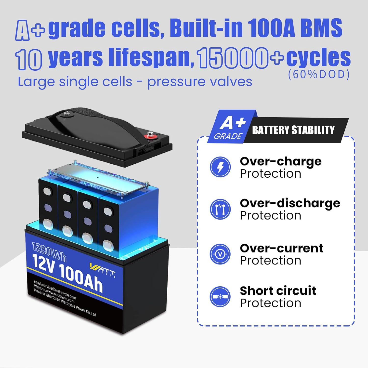 - 🍃-Our LiFePO4 batteries are designed to be environmentally friendly and safer, with a 100Ah capacity and 12.8V standard voltage.