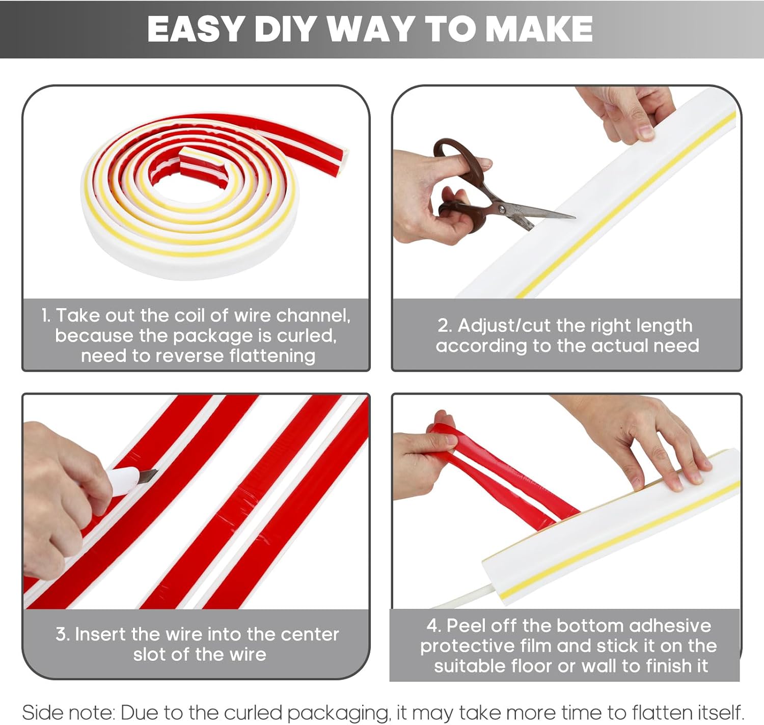 - [Easy to Use] No need other professional tools to assist the installation. Just cut the length you need and put the wire in the channel. Peel off the film and then stick it to the floor or wall. Floor cord cover by Chudeng is good for any flooring, such as hardwood floors, tiles or carpets.