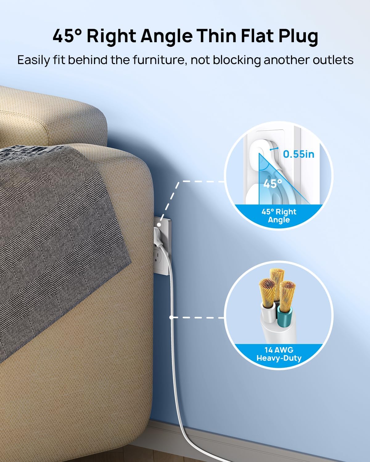 - 【Flat Plug Power Strip】Our power surge protector 1875W/15A heavy-duty design with a 10ft extra long extension cord, 14AWG pure copper wire is stronger, current carrying capacity, low heat, and safer. The low-profile space-saving 45° angled flat plug eliminates awkward cords from cluttering indoor décor and doesn’t block the bottom receptacle