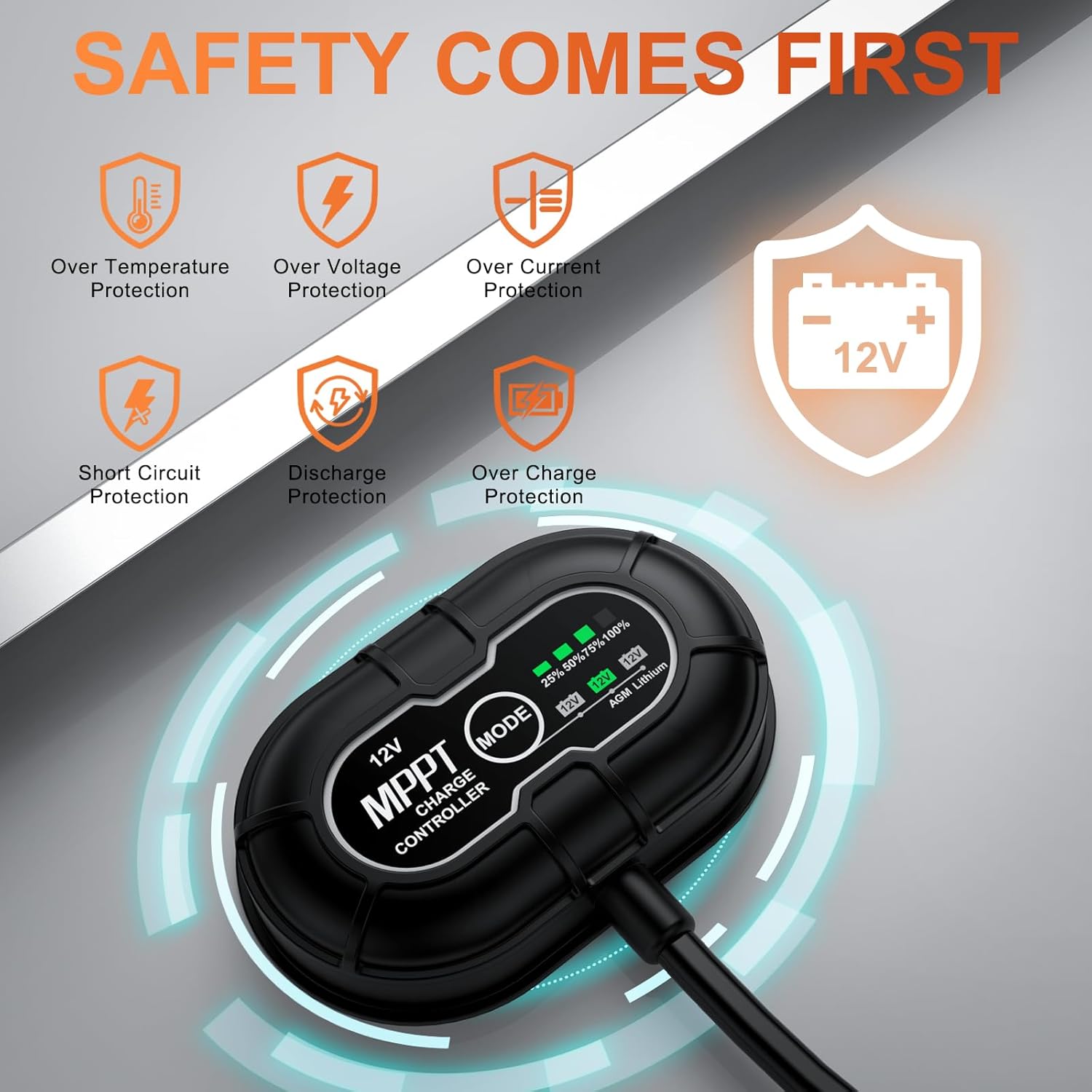 - 【Ultra-Smart MPPT Technology】This 12v solar panel battery charger is crafted with SUNER POWER's unique Ultra-Smart MPPT technology, the innovative MPPT ( Max Power Point Tracking) allows to deliver high tracking efficiency of up to 99% and peak conversion efficiency of 98%, improving approximately 20%-30% utilization rate than other competitors.