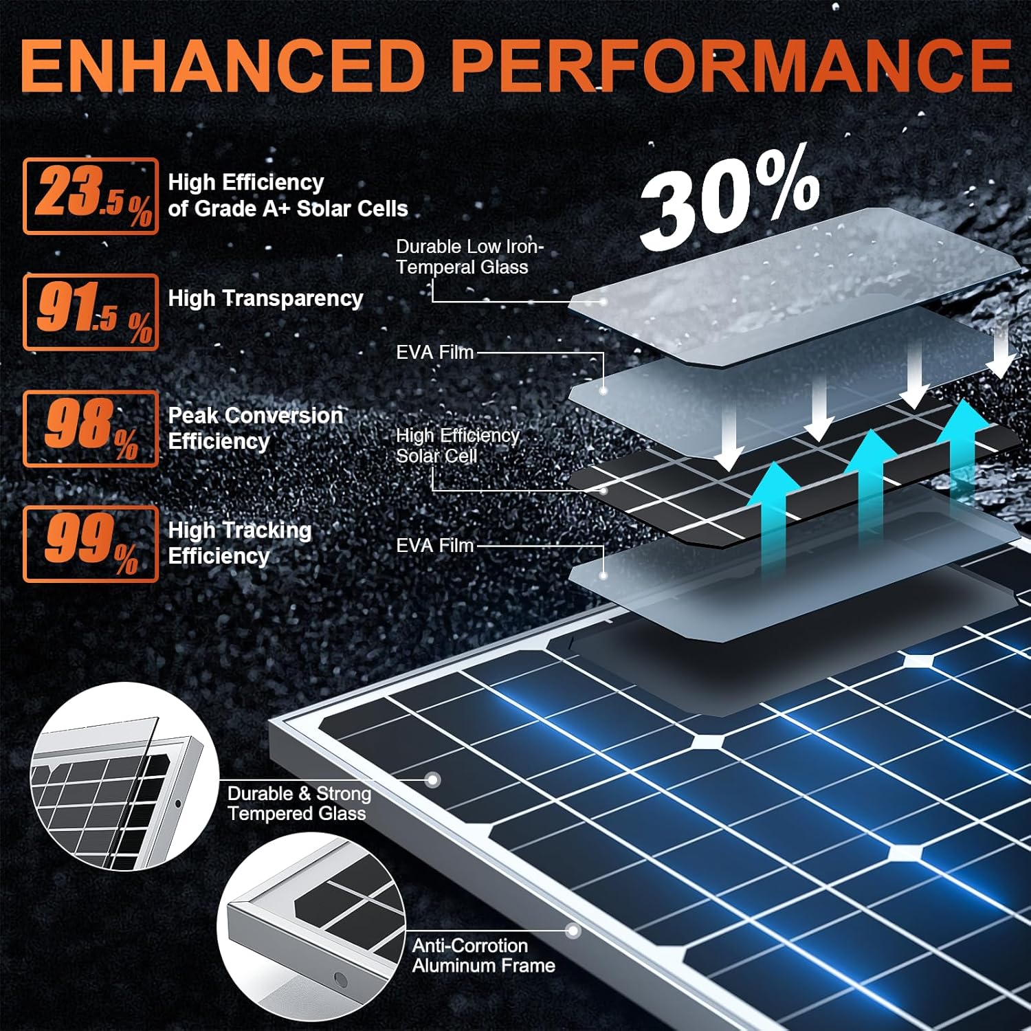 - 【 Superior Quality and Material】Made of premium Grade A+ solar cells with efficiency up to 21%-30%, tempered solar glass and durable corrosion-resistant aluminum frame, withstand extreme weather conditions like UV, anti-rusting, and erosion, hail, and sandstorm, up to 2400Pa wind pressure and 5400Pa snow load.