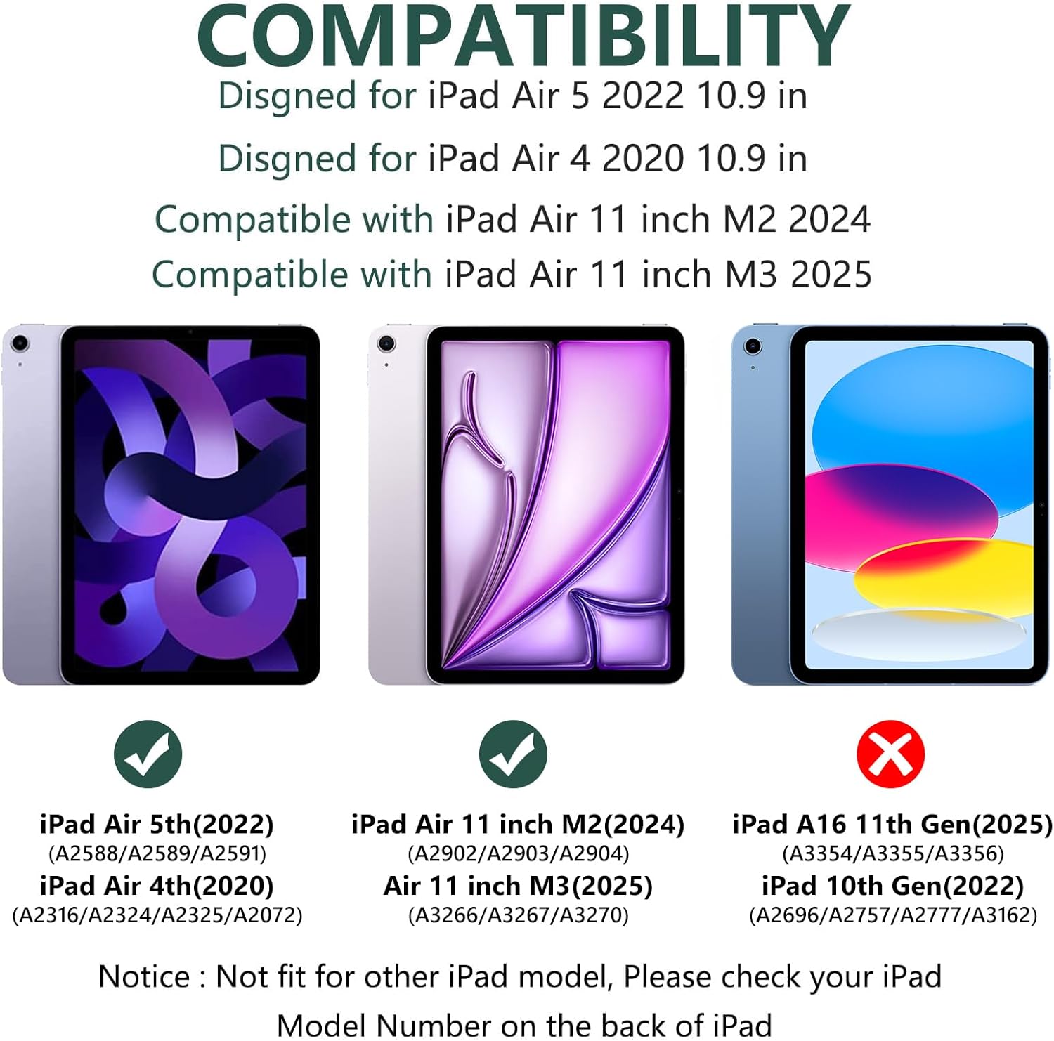 - For iPad Air 11 inch Case with Keyboard: This for ipad air keyboard case compatible with iPad Air 11-inch M3 2025 (A3266/A3267/A3270) , compatible with iPad Air 11-inch M2 2024 (A2902/A2903/A2904), compatible with iPad Air 5th Generation 10.9 inch 2022 (A2588/A2589/A2591), compatible with iPad Air 4th Generation 2020 ( A2072/A2316/A2324/A2325 ), compatible with iPad Pro 11 inch 1st Generation 2018 (A1980/A2013/A1934). ( Please kindly check the model number on the back of iPad before purchasing.)