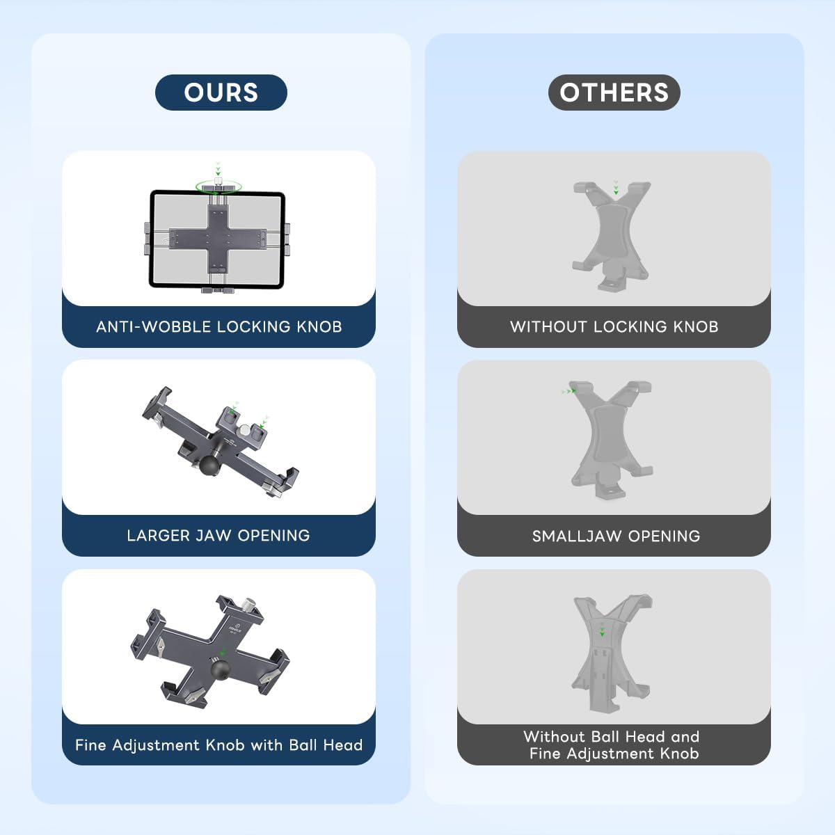 - 【Sturdy and Durable】This tablet holder is made of aluminum alloy material base, which is very strong and durable, and can withstand frequent daily use. The sturdy telescoping arm has dual ball joints at each end, allowing for 360-degree adjustment and easy repositioning. You can use it on a table, cart, desk, in your car, or any flat surface, and the car ipad holder will stay where you installed it.