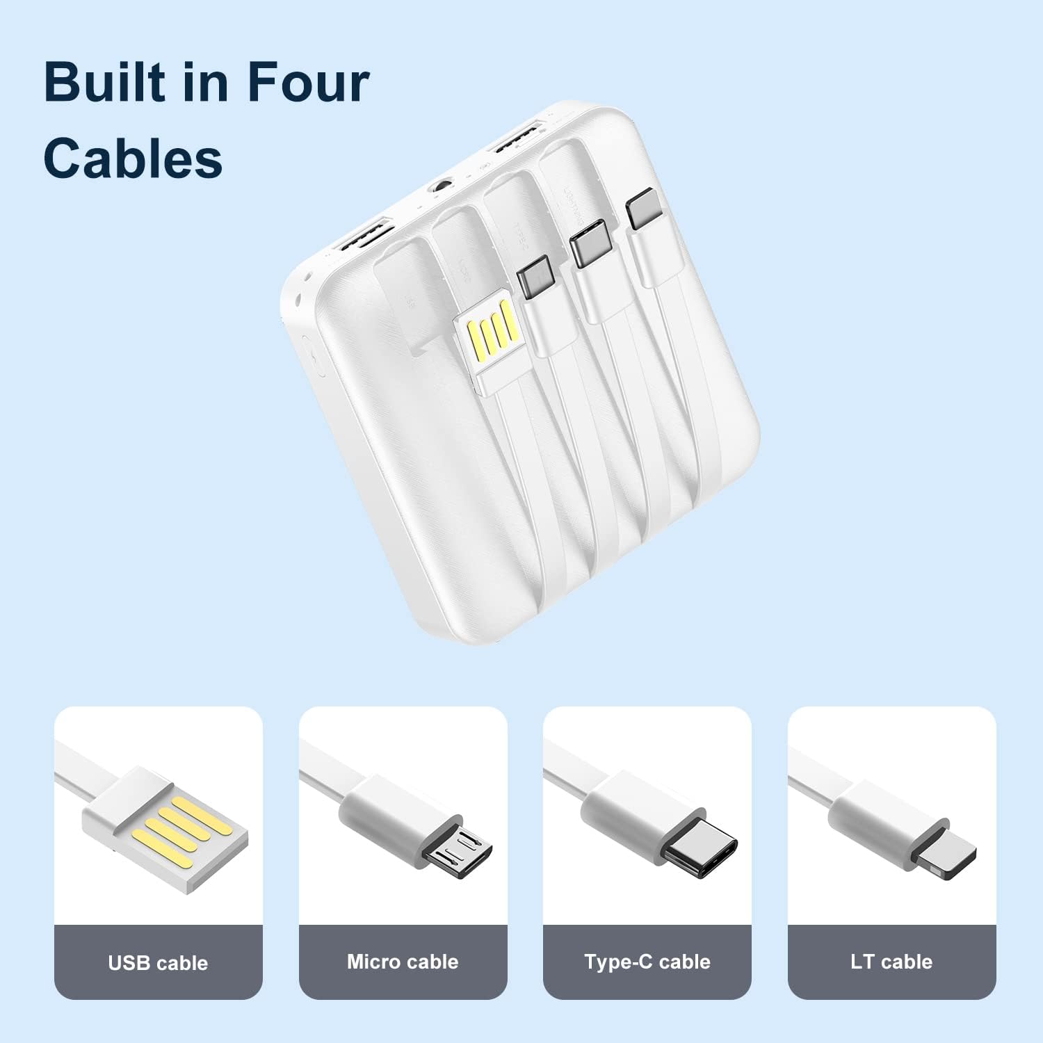 Solar Power Bank 12000mAh,Small Solar Charger Built in 4 Cables,USB C Input/Output,Dual Flashlight External Battery Portable Charger Power Bank for iPhone,Tablet,Samsung