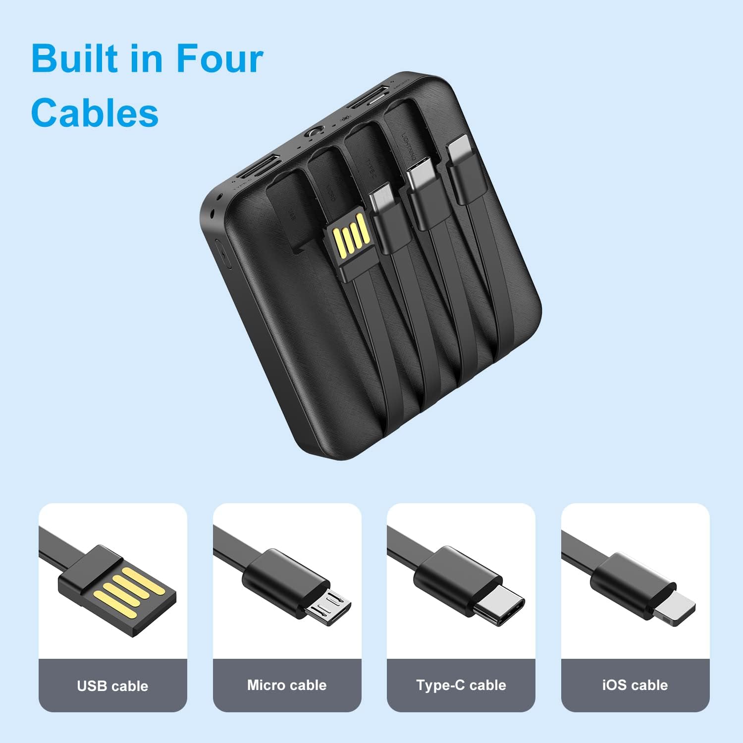 Solar Power Bank 12000mAh,Small Solar Charger Built in 4 Cables,USB C Input/Output,Dual Flashlight External Battery Portable Charger Power Bank for iPhone,Tablet,Samsung
