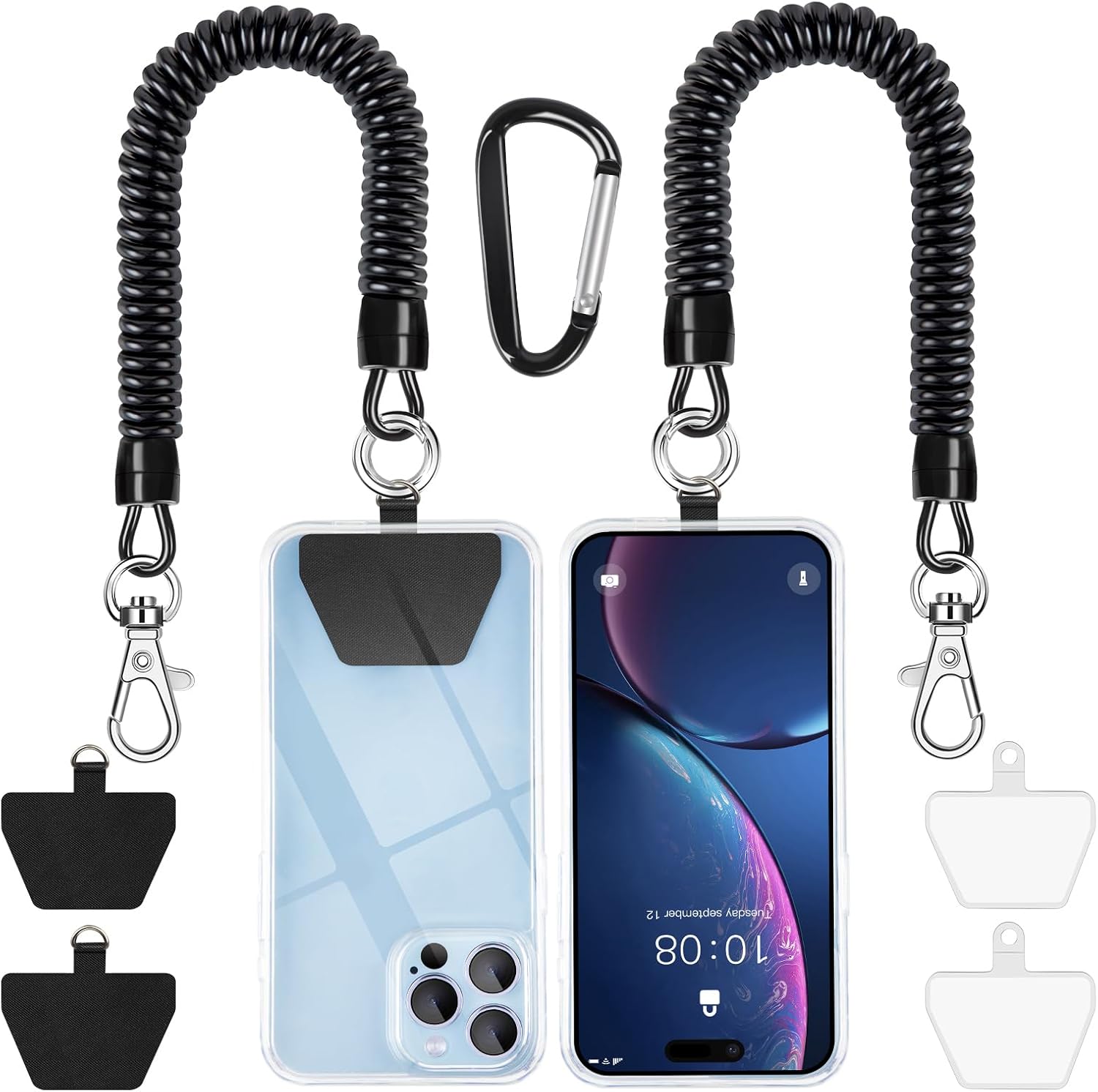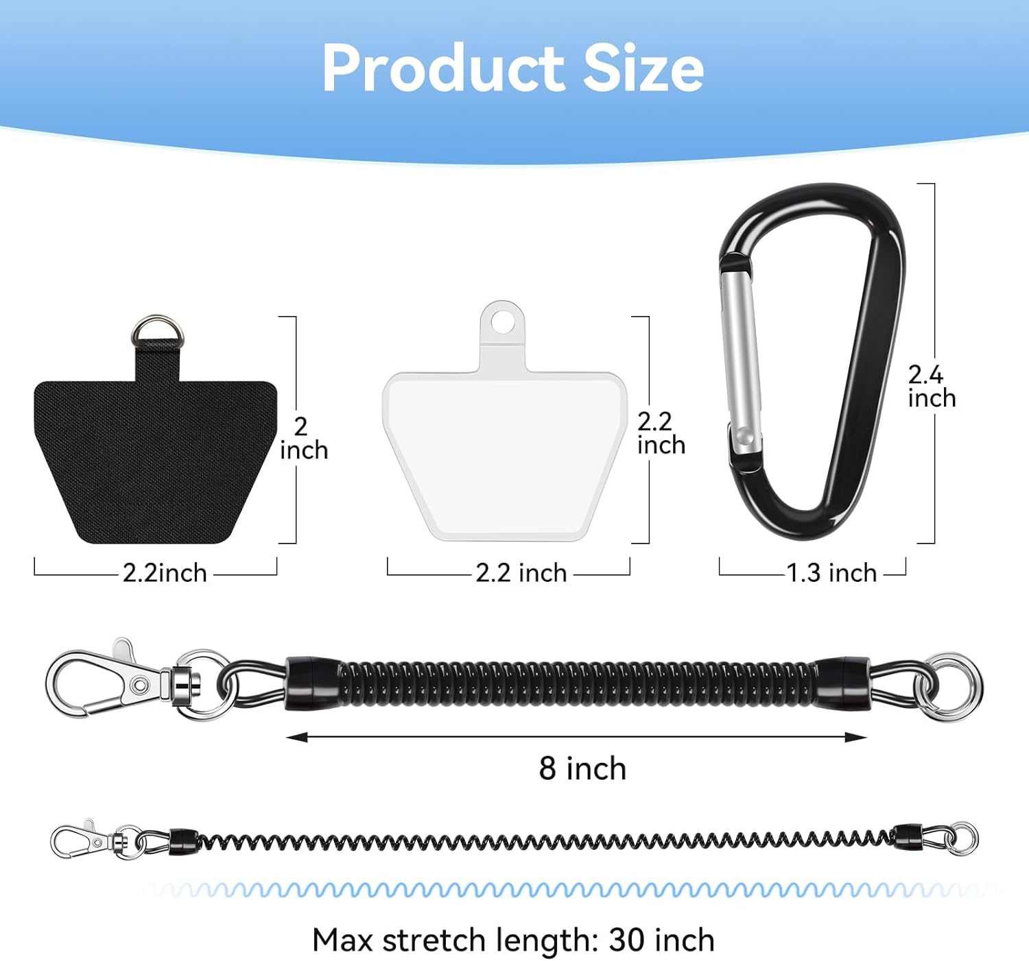 - Phone lanyard tether: 1x Carabiner, 4x Pads and 2x Spring phone tether. The anti theft phone strap allows for easy attachment to backpacks, belts, or wrists, providing convenient access to your phone while keeping it close at hand