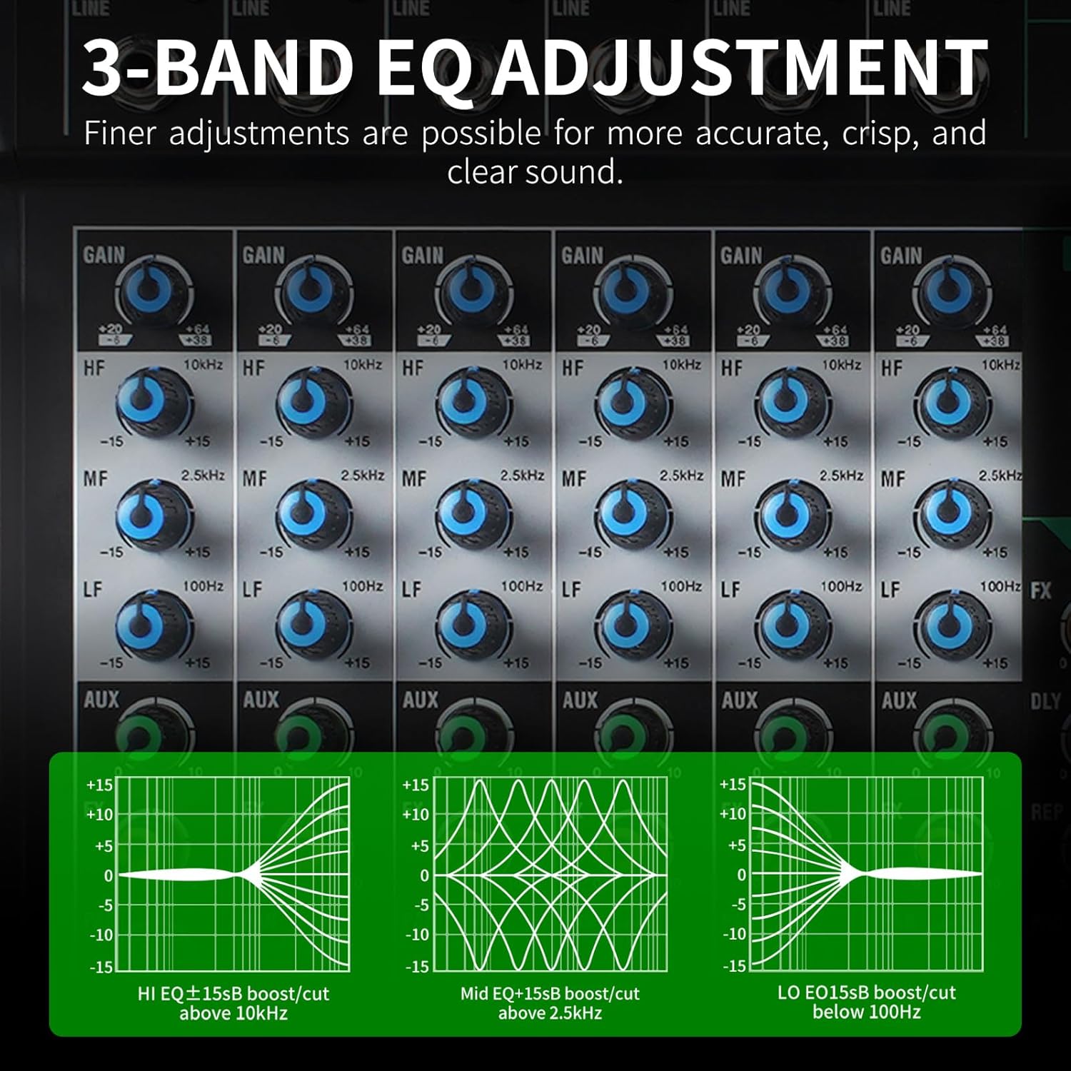 - Multi Devices Compatibility:This portable 6 channel mixer has Bluetooth for wireless streaming and use it as an input to mix signal with other input channels. It works with IOS, Android, Tablet and MP3 Player.