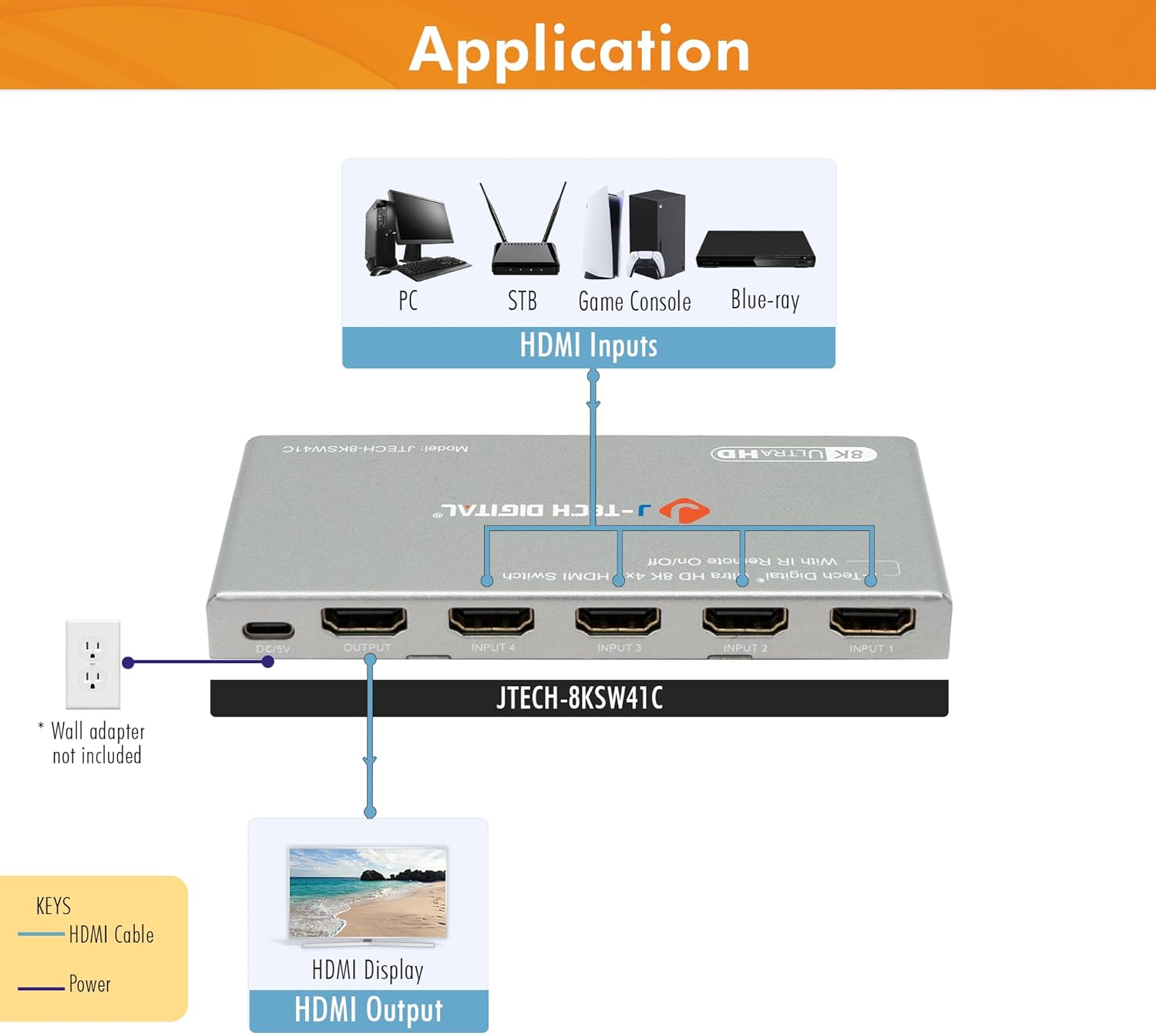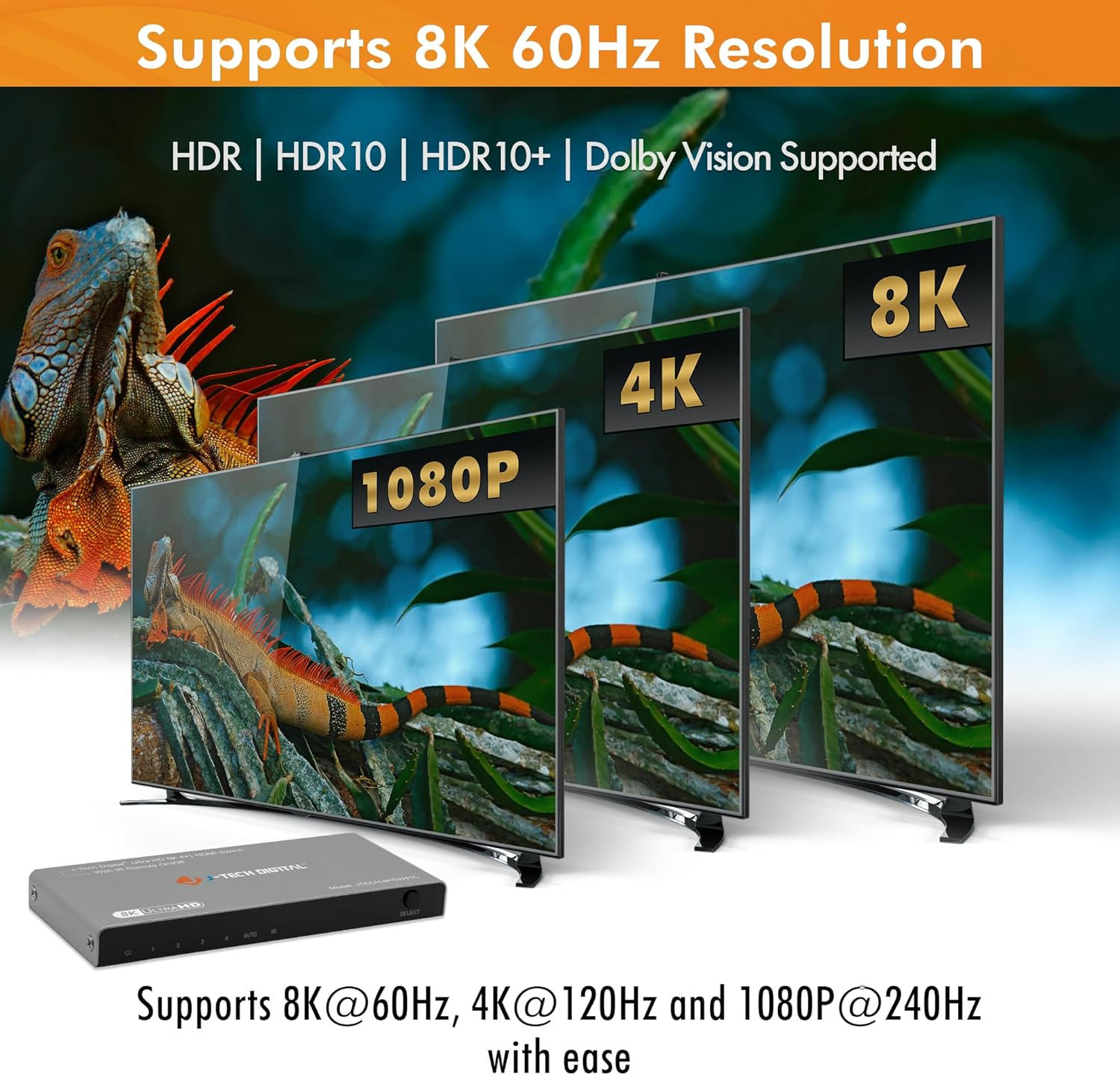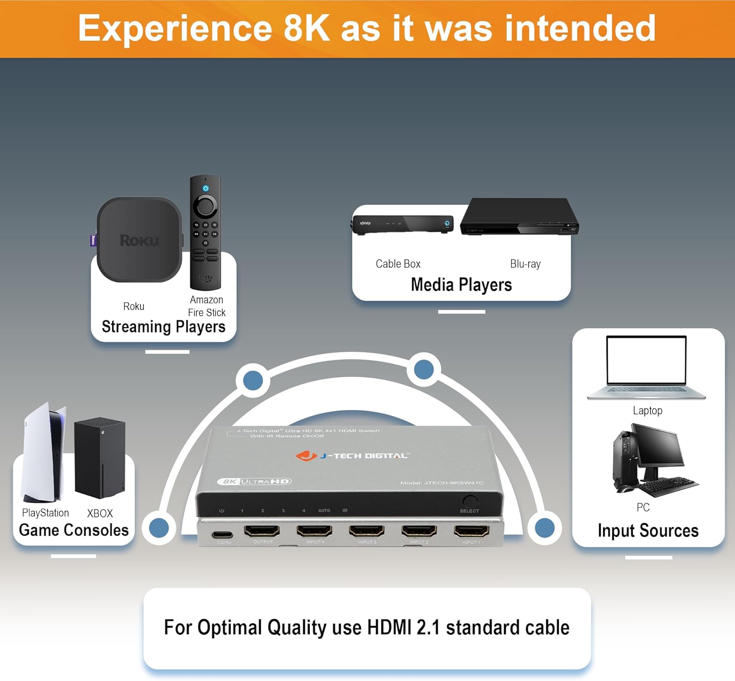 J-Tech Digital HDMI Switch 4K 120hz, 2.1 Switch 4 in 1 Out, 8K 60Hz 1080P 240Hz IR Remote Auto Switch USB C Power Cable, Compatible with HDR & Dolby Vision ALLM VRR QFT [JTECH-8KSW41C]