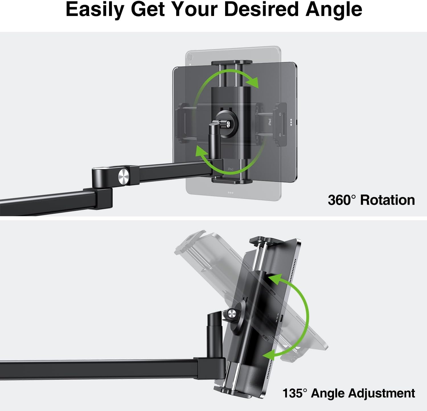 - 【Long Reach & Tall】711 mm / 28 in horizontal reach covers large desks, rise your devices up to 508 mm / 20 in vertical (with extension arm), which mean that you can mount your iPad to any position, any angle with no effort. This iPad arm mount is great for desk iPad overhead recording, video conferencing, zoom meeting, iPad or portable monitor as your second screen for working, watching and reading in your bed or sofa.