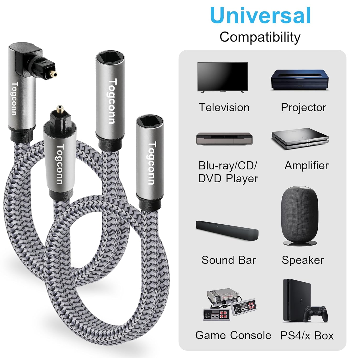 - Widely Compatible : Togconn male to female toslink cable allows you all Toslink (S/PDIF, Optical) interfaces. Compatible with home theatres to TV, PS4, Xbox, DVD Players, Blu-Ray, receiver. No signal loss or noise, providing you with reliable and crisp stereo sound.
