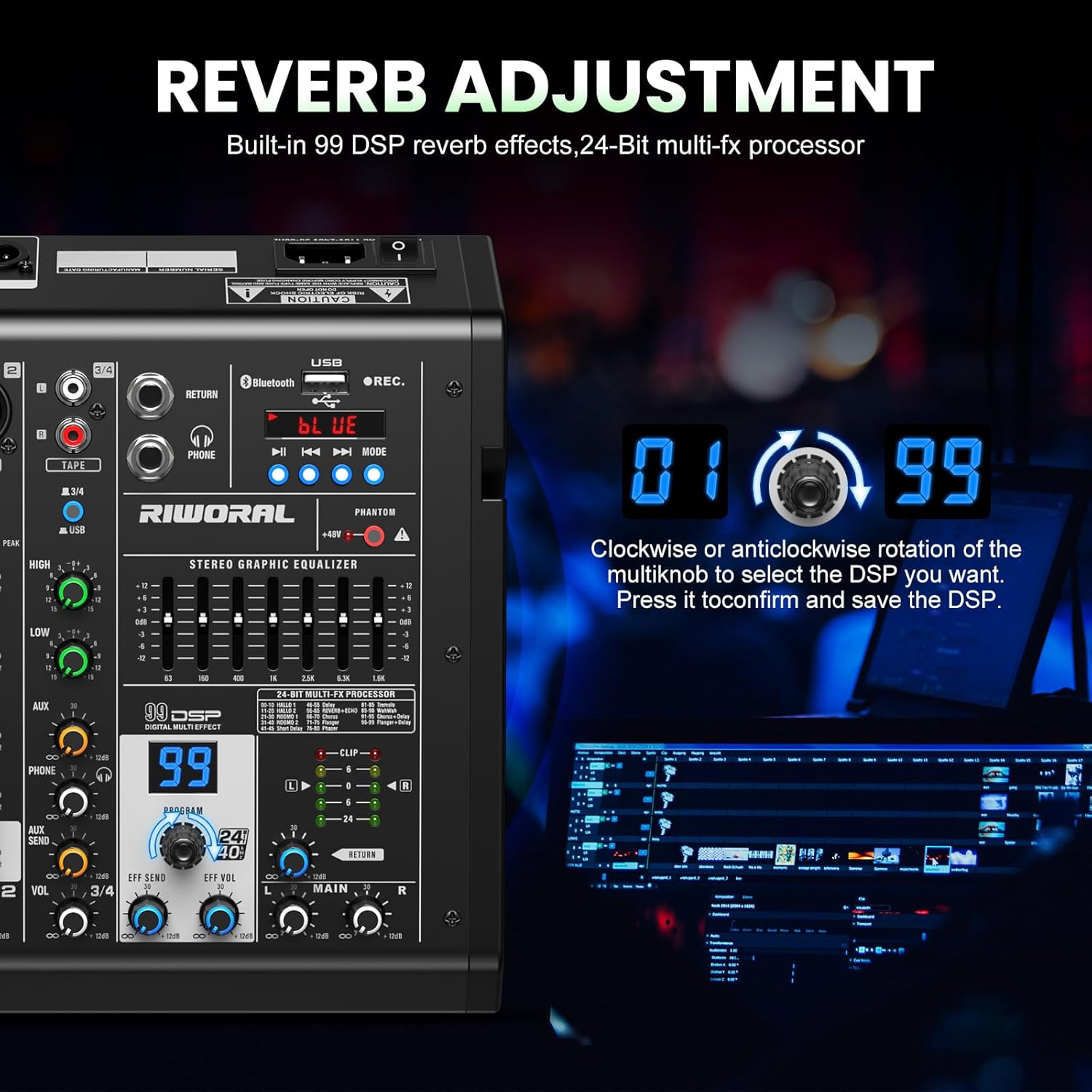 4 Channel Audio Interface DJ Mixer with 99 DSP Reverb Delay Effect USB Audio Interface +48V Phantom Bluetooth for Karaoke Studio Streaming Recording,Live Broadcasting,Podcasting