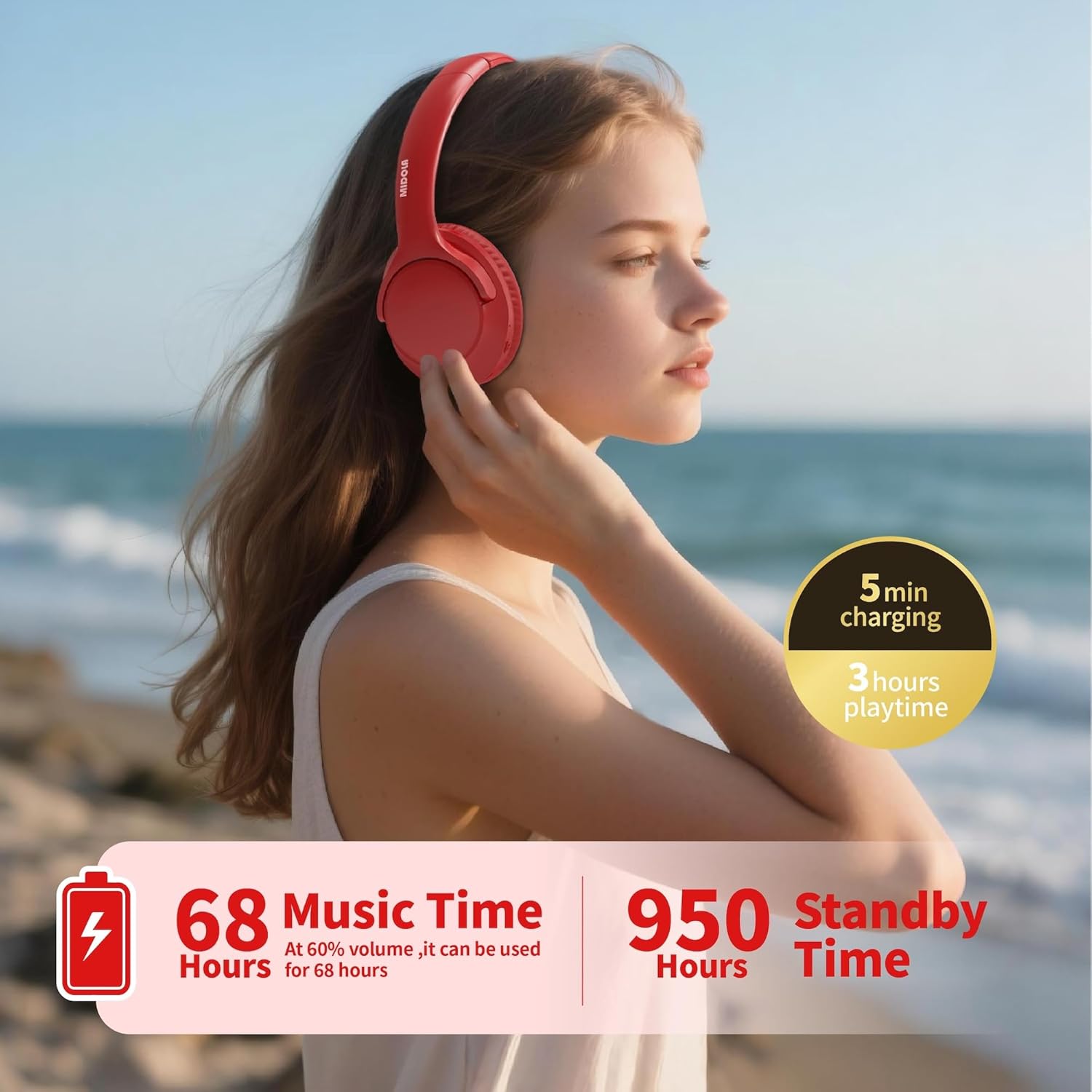 MIDOLA Bluetooth Headphones Over Ear 68H Playtime 6 EQ Wireless Headset with Microphone HiFi Stereo Foldable Lightweight Deep Bass for Travel Home Office Cellphone Red