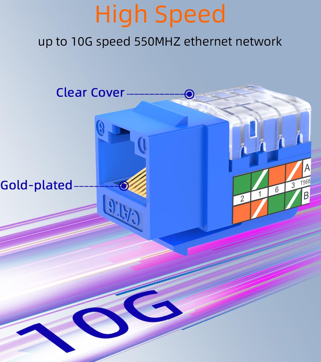 - 【10G Applications】: Rj45 keystone are golden plated and designed for high-speed data transmission up to 10G speed 550MHZ ethernet network. Rj45 ethernet jack is compatiable with the latest TIA-568.2-D standard.
