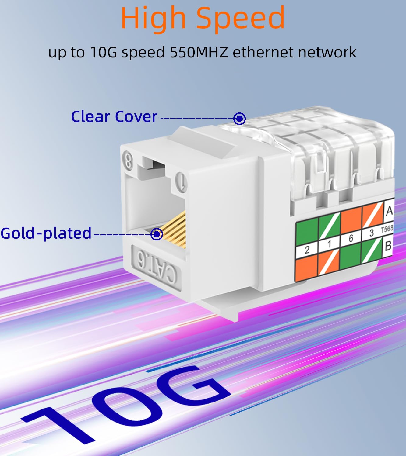 - 【10G Applications】: Rj45 keystone are golden plated and designed for high-speed data transmission up to 10G speed 550MHZ ethernet network. Rj45 ethernet jack is compatiable with the latest TIA-568.2-D standard.
