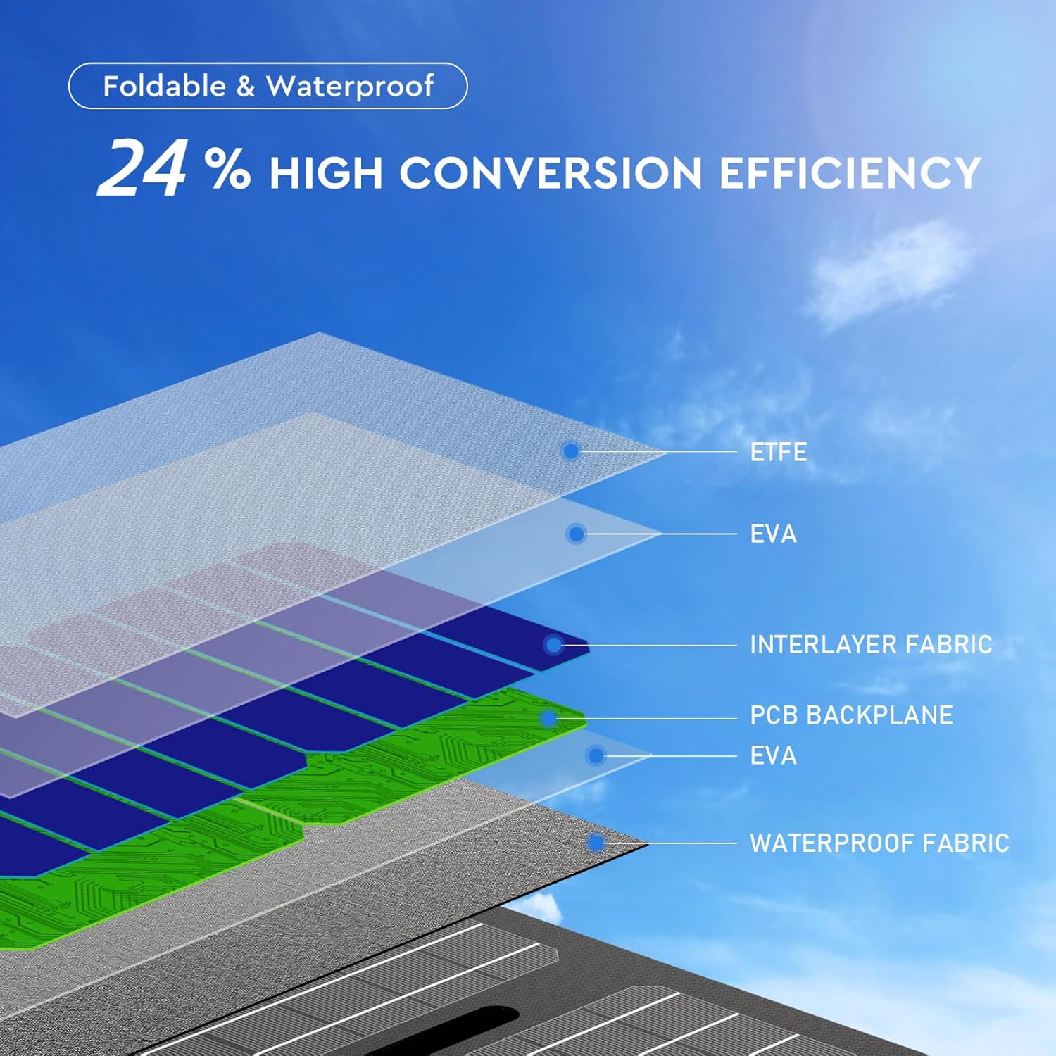 - 💡【24% HIGH CONVERSION SOLAR PANEL】24% high conversion efficiency enables Powkey 30W portable solar panel to generate electricity and energy in low-lux outdoor environment(>40000 Lux). The built-in smart chip intelligently identifies your device and maximizes its charging speed while protecting your devices from overloading. The USB QC 3.0/ DC ports and its accessories(1 DC to DC cable and 10 in 1 connector allow this solar panel kit be compatible with most portable power stations or electronics on the market.