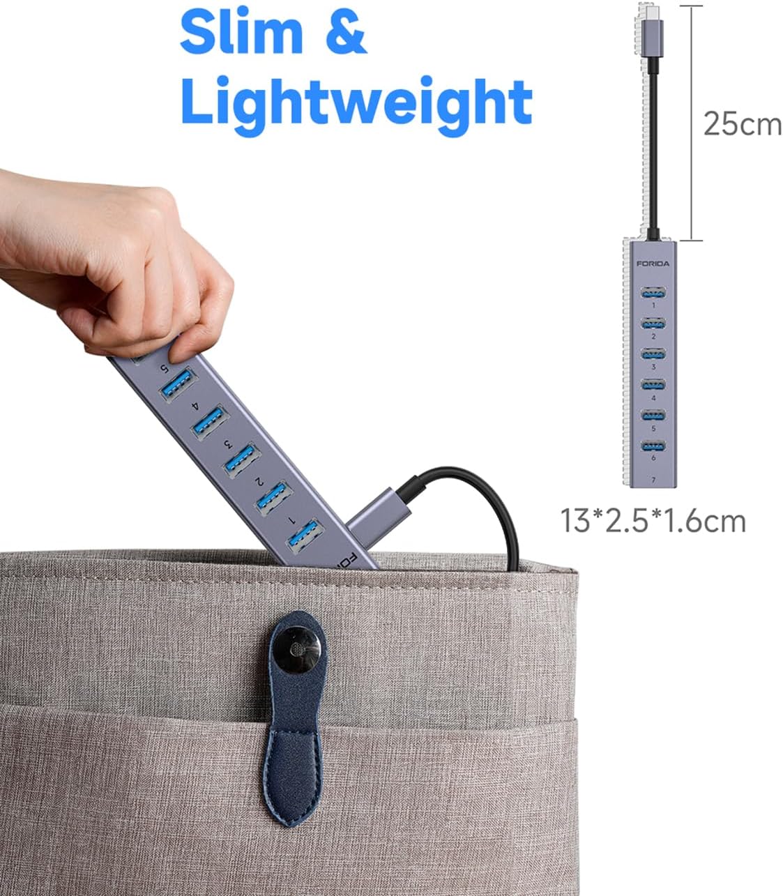 - 【7 Port USB HUB 3.0】FORIDA USB C HUB turns one USB port into Seven, support for USB Flash drive, Mouse, Keyboard, Printer, or any other USB Peripherals. And it's backward compatible with your older USB 2.0 / 1.0 devices.