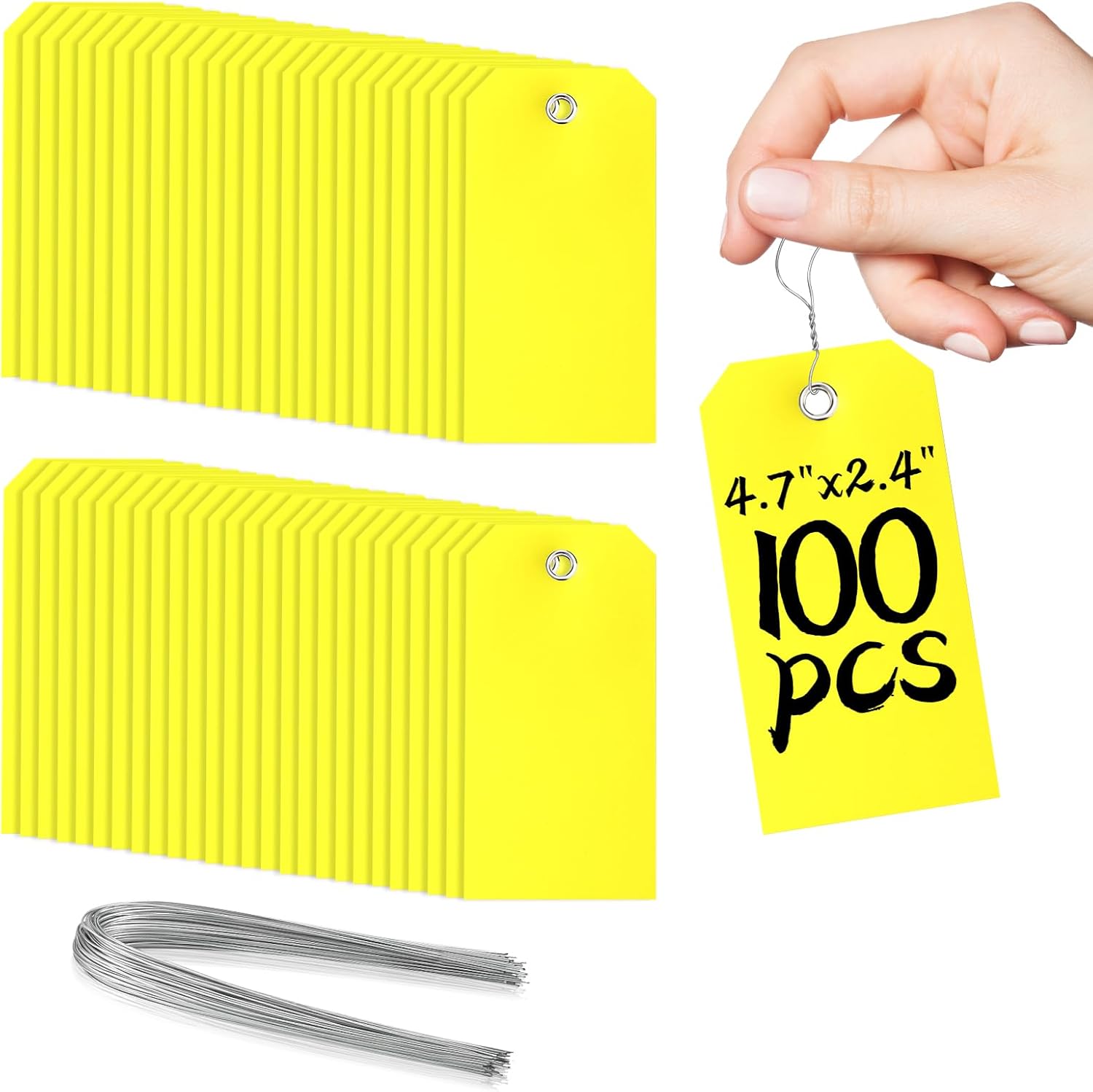 100Pcs Shipping Tags with Wire Ties Plastic Hang Tags for Labeling Blank Tags with Holes Waterproof Equipment Moving for Outdoors Auto Parts Luggage Garage Inventory(Yellow, 4 3/4" x 2 3/8")