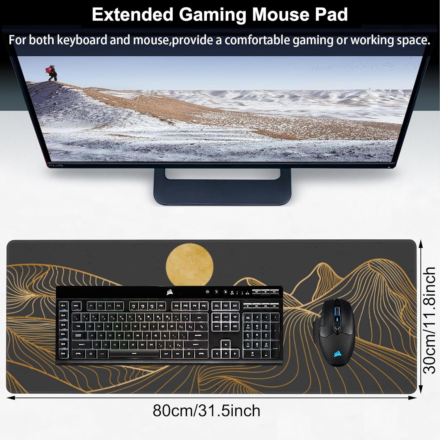 Abstract Golden Mountain Desk Mat,Large Gold Line Art Gaming Keyboard Mouse Pad,Non-Slip Rubber Base Desk Pad Thick Stitched Edges Waterproof Mousepad Mouse Mat 31.5"x11.8"