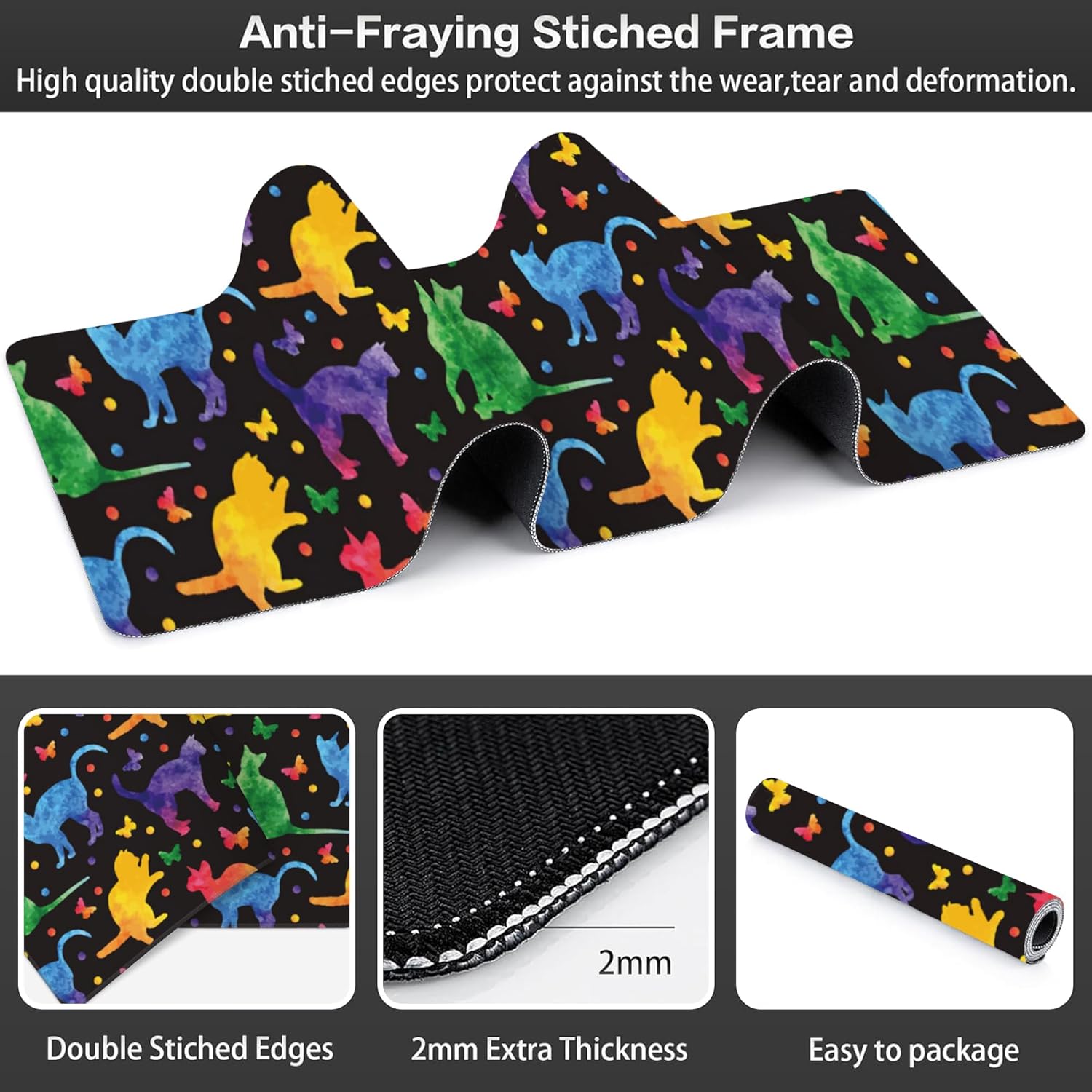 Colorful Cats and Butterflies Desk Mat,Large Watercolor Kittens Butterfly Gaming Keyboard Mouse Pad,Non-Slip Rubber Base Desk Pad Thick Stitched Edges Waterproof Mousepad Mouse Mat 31.5"x11.8"
