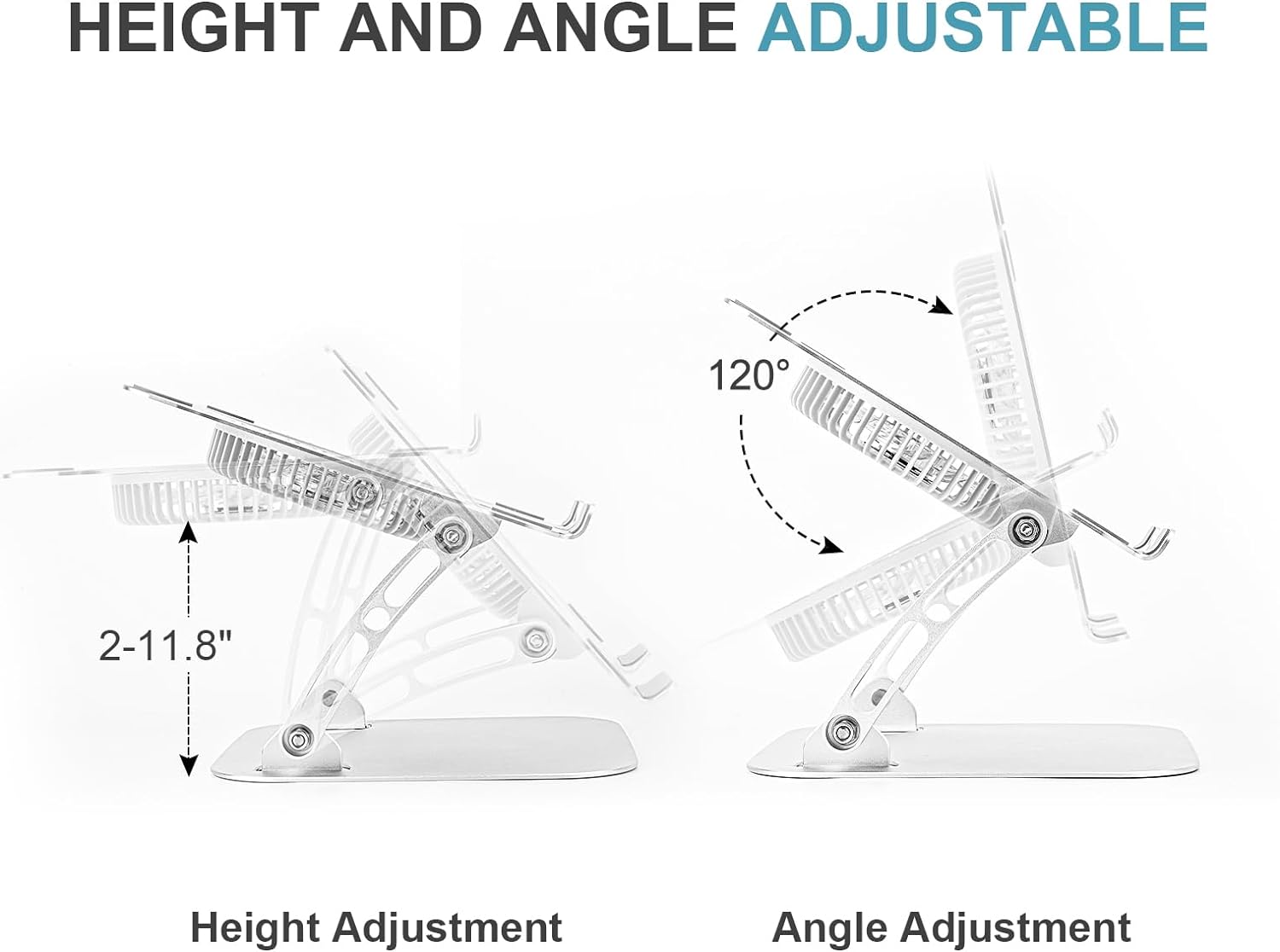 - [Height and Angle Adjustable]- Working in your most comfortable position can boost your productivity and creativity. This laptop stand allows you to adjust freely the height to 11.8 inches adjust angle from 0 to 120 degrees, so you can comfortably work in sitting positions.