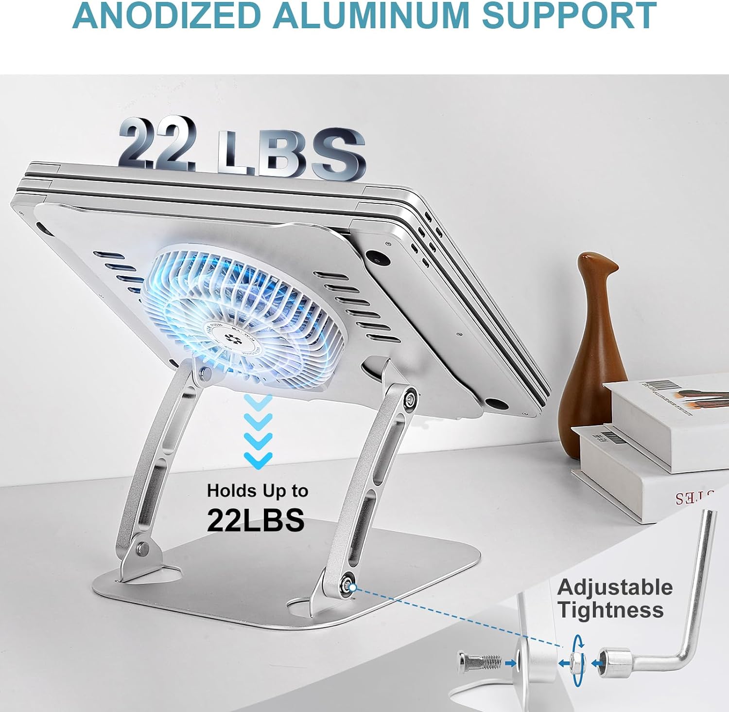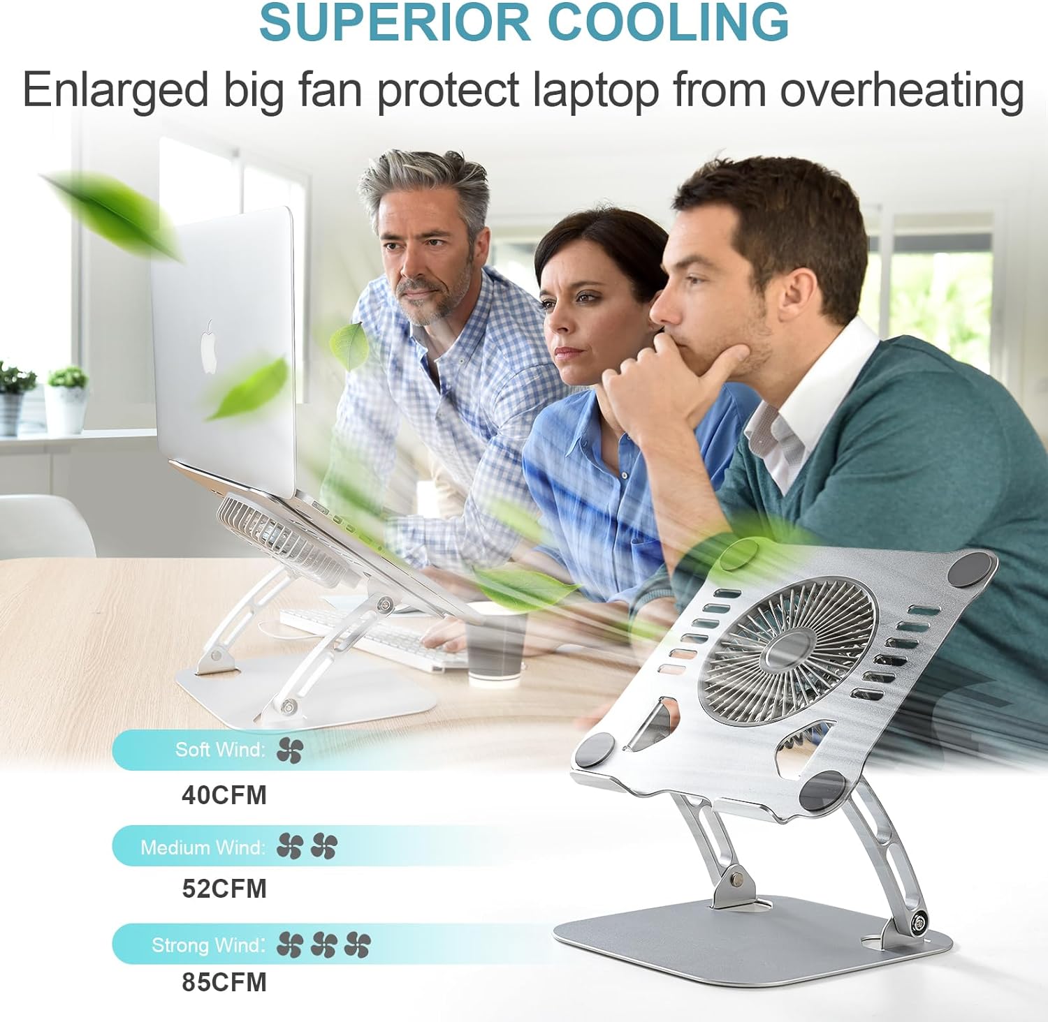 SHUWEI 360° Rotating Laptop Cooling Stand with 3 Speed Fan, Adjustable Height Laptop Stand for Desk, Ergonimic Aluminum Laptop Cooling Pad for 10-15'' Notebook - Silver