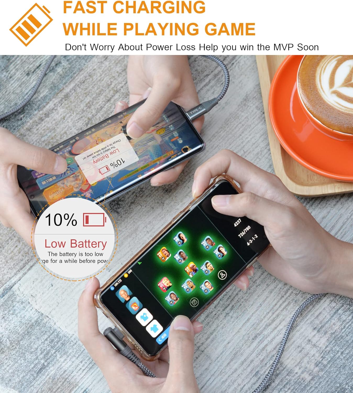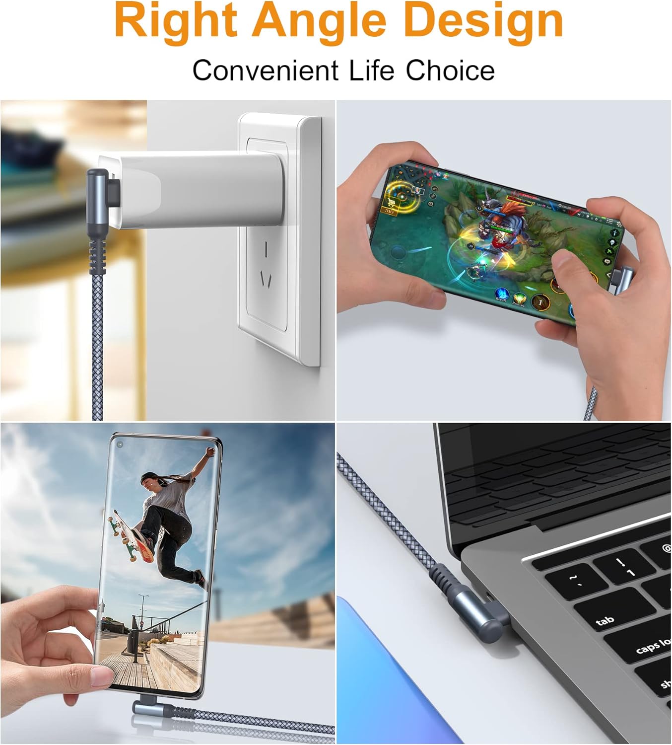 - [Upgraded USB-C Right Angle Design]: This right angle type c charging cable fast charge with an innovative 90 degrees " L " design. It's user-friendly design more convenient and comfortable for playing games, watching videos, reading e-books when you charging.