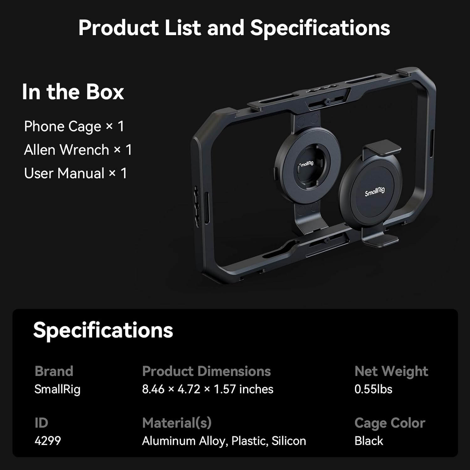 - 【Aluminum Alloy Material】The universal mobile phone cage 4299 is made of aluminum alloy to be lightweight yet sturdier. Besides, the built-in rubber pads of phone cage ensure the smartphone in place and away from scratching. SmallRig phone video rig provides a professional and convenient solution for mobile video shooting and live broadcasting.