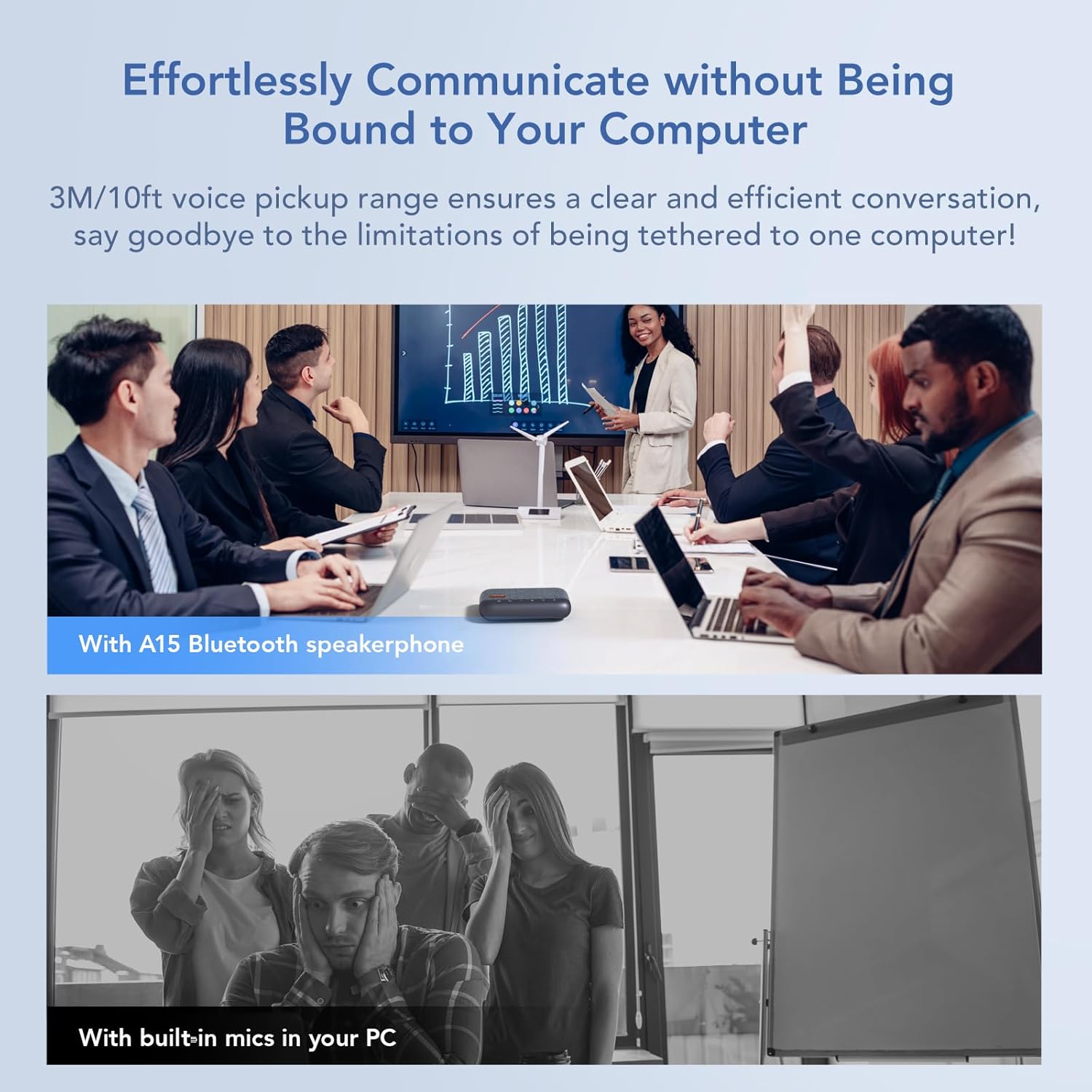 - 360° Omnidirectional Mic & Daisy Chain: Nuroum A15 conference speaker and microphone is built with 4 professional-level microphones that capture clearly all voices at a 360-degree angle. The conversations are picked up with a strong sound and natural bass. In addition to individual home office, the speaker mic is ideal for corporate meeting rooms with up to 10 people. By cascading 2 A15 units, conferences with even 20 participants can be supported.