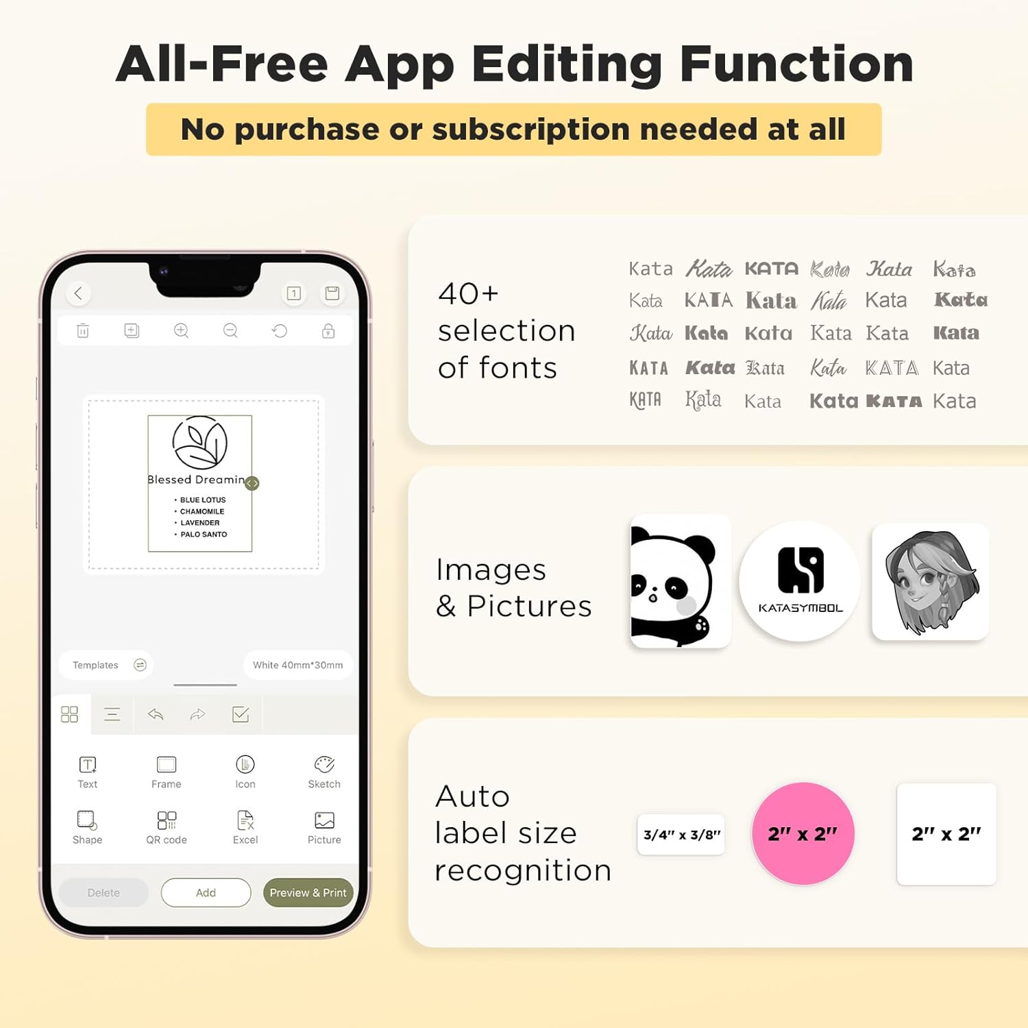 - Versatile App Editing Function: Easily add images from your phone or tablet; customize your labels with 40 fonts, 50 frames, and 650+ icons; all free to use