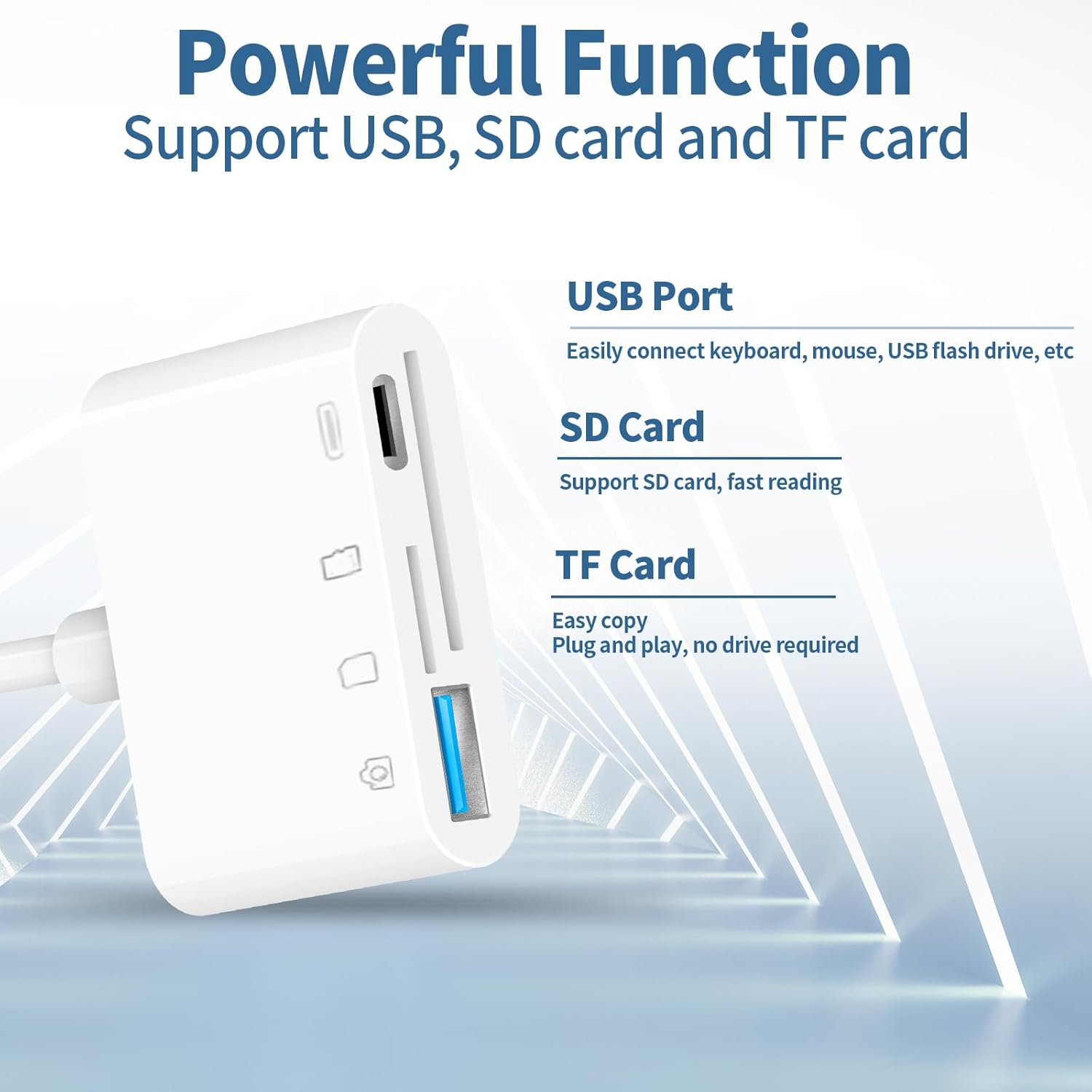 - 【4 IN 1 Camera Reader Adapter】This sd to iphone adapter gives you two ways to import photos and videos, one is via using USB cable, the other is to read form SD/TF card directly. The iPhone SD card adapter transfers photos and videos from camera or memory card to your iPhone/iPad at 600MB/S-900MB/S(USB 3.0 speed). Perfect for use with keyboards, mice, gamepads, flash drives, hard disks, Type-C smartphones, iPhones, iPads, and more.