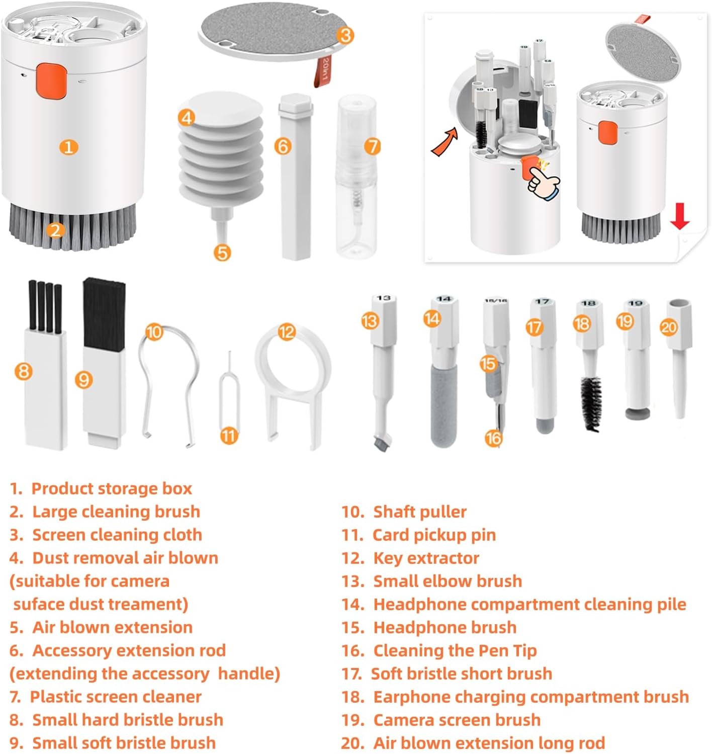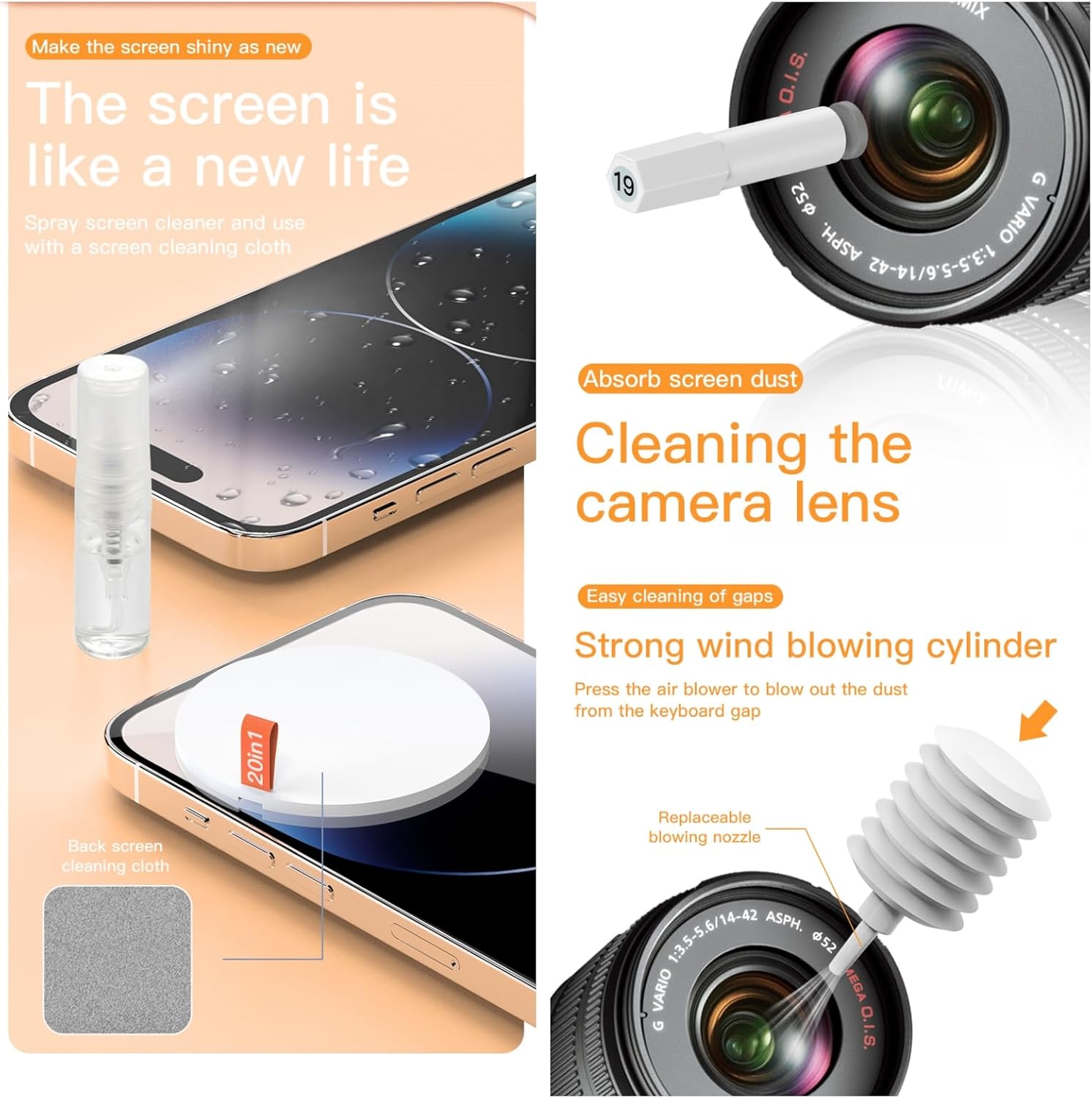 - đżă20-in-1 Keyboard Screen Cleaning Kită: The computer cleaning kit includes retractable large brush, Airpod crevice cleaning pen, mini brush and flocked sponge brush, headphone case cleaning brush, charging port brush and camera screen brush, etc. (all of these brushes have extension rods for easier use). The cleaning kit also includes a screen cleaning cloth and spray bottle, keycap extractor, shaft extractor, 2 extension poles, blower, dual brushes (hard and soft bristle), and a card removal pin.