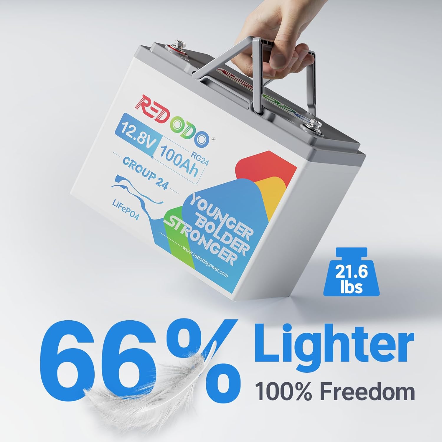 - 【1/2 Lighter & 2X Running Time】Redodo's 12V 100Ah Group24 lithium battery weighs about 21.56 lbs, with a high energy density of 59.37Wh/lb, which is 1/2 lighter than a 12v 75Ah Group24 lead acid battery (weighs 52lbs). Moreover, Redodo 12V 100Ah Group24 battery runs TWICE as long as the 75Ah Group24 SLA battery (60% Discharging Rate).